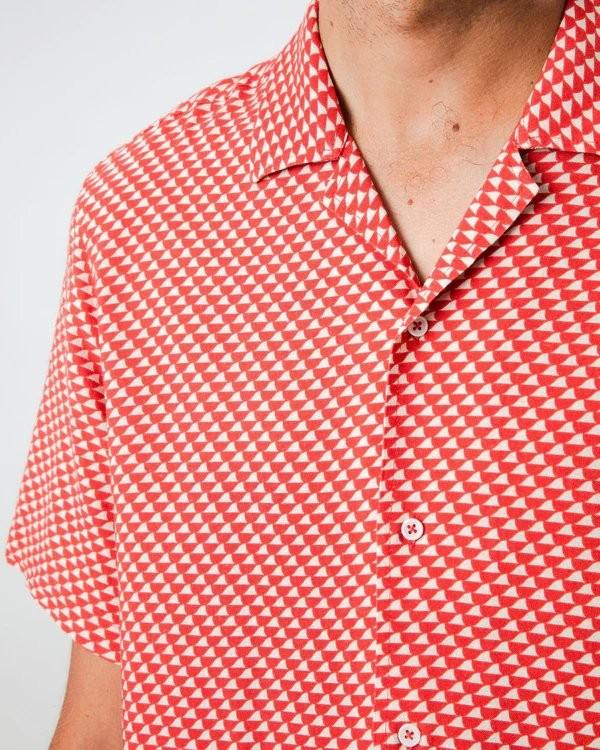 Printed relaxed-fit short sleeve aloha shirt. It features a slightly dropped shoulder, straight hem, camp collar, and button closure.