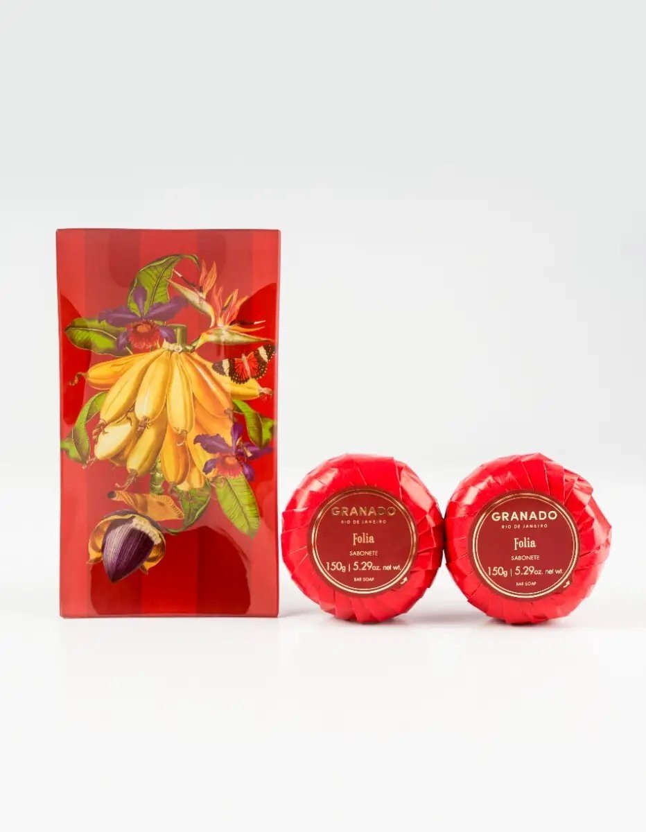 The Tropical Exuberance Collection leads us on a magical journey through Granado’s history. Inspired by the richness of Brazilian flora, the collection dives into the brand’s perfumery universe to highlight all the opulence and liveliness of our forests. The Folia Duo Kit comes with two 150g bar soaps and a glass tray illustrated with the collection''s identity.