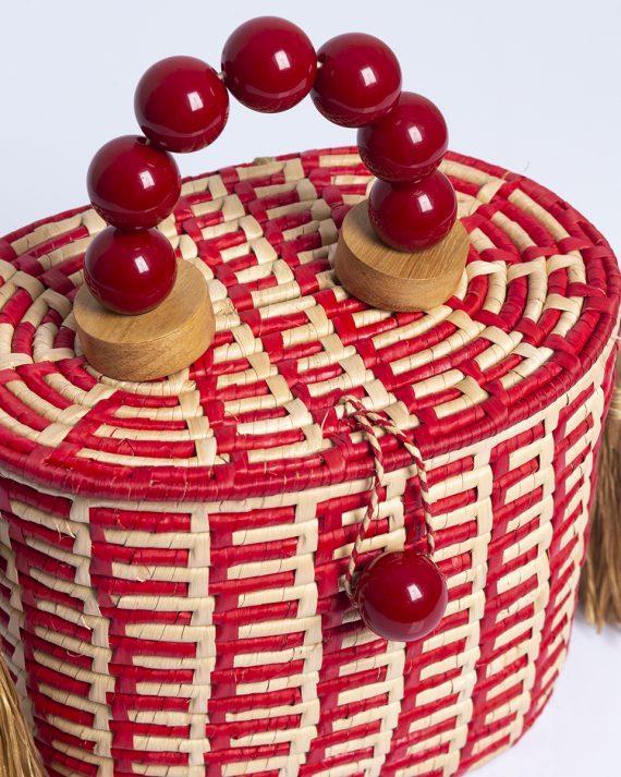 The Jirau Basket bag is handmade with straw by the artisans of O Ará, Catarina Minas new project. Features a hand strap with small balls and wood detailing, a removable shoulder strap, 2 silk straw pompoms, button closure and lining with cardholder inside.