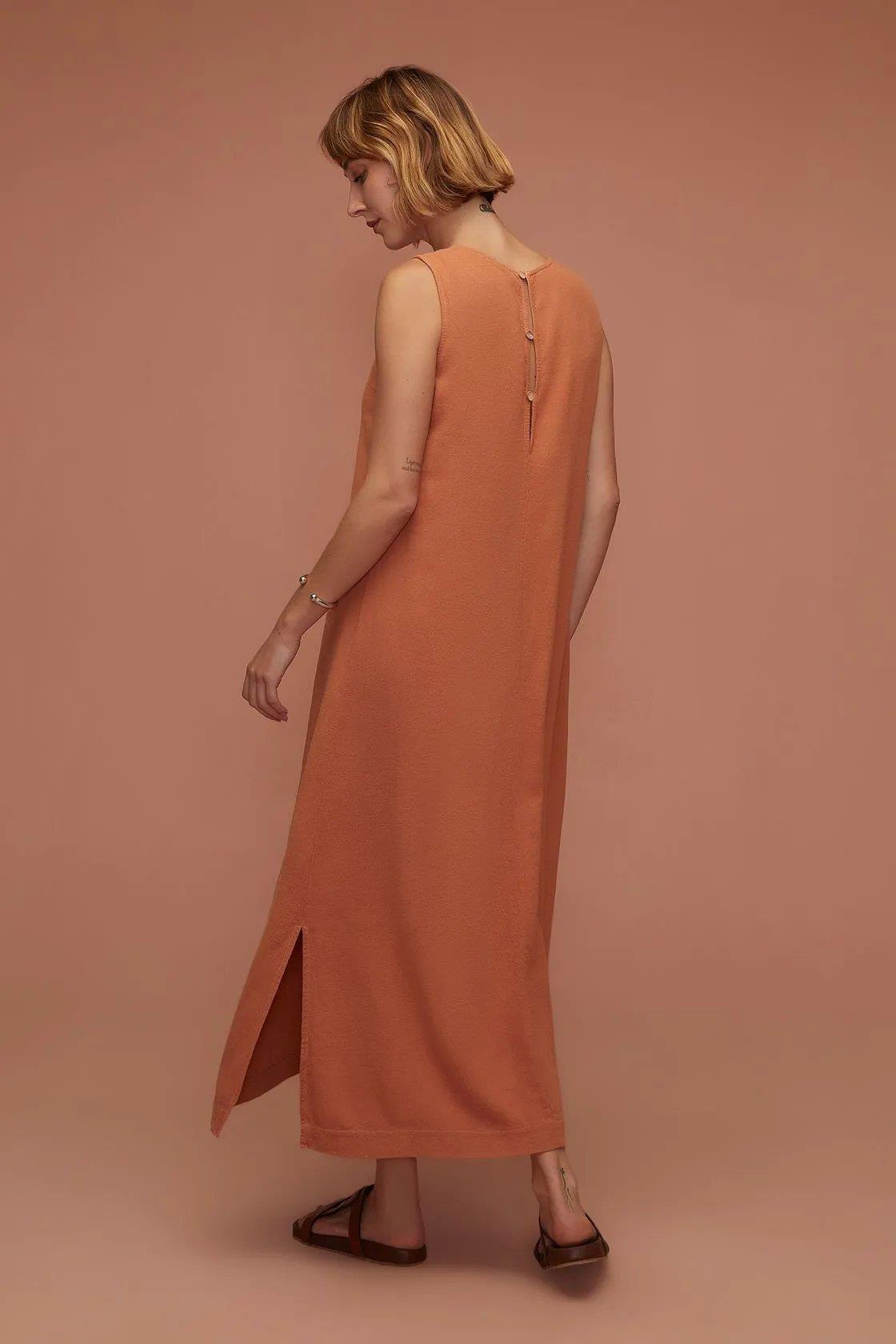 Midi-length tank top. Round neckline. Back opening with view and mother-of-pearl button closure. Side slits. Garment hand dyed and stoned.