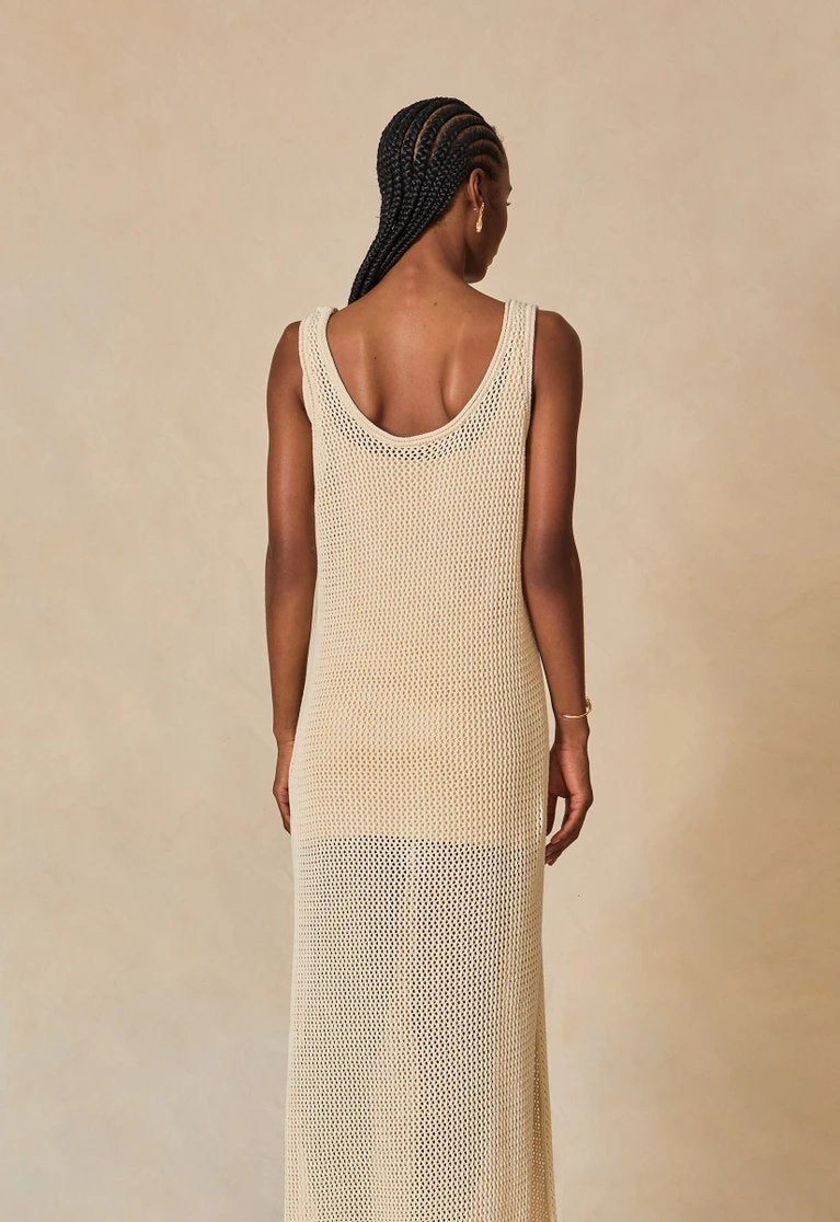 Natural elegance flows effortlessly in the Suzana Midi Dress — a lightweight, relaxed knit crafted from 100% organic cotton yarn. With its clean lines, open neckline, and earthy texture, this piece brings quiet sophistication to warm-weather dressing.