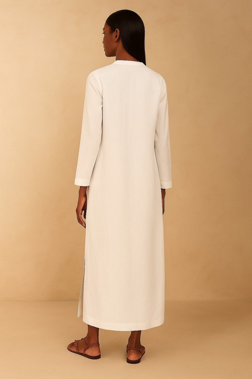 Featuring a clean, straight-cut back and side slits for ease of movement, the dress brings fluidity and grace to everyday dressing. The mandarin collar and delicate button placket — which extends only to mid-body — add gentle structure without compromising comfort. Ideal for serene mornings, creative workspaces, or leisurely escapes by the sea, it invites calm confidence and timeless ease.