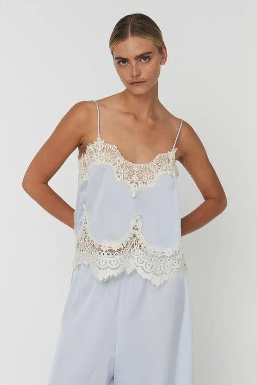 Effortlessly sensual and quietly luxurious, the Delicate Lace Top is one of those pieces that makes getting dressed feel like a pleasure. The soft Dust Blue fabric falls smoothly against the skin, while ornate cream lace trims the neckline and hem in a scalloped, floral pattern that feels intimate and refined all at once. Thin adjustable straps keep the silhouette light and feminine, and the cropped length makes it ideal for pairing with high-waisted trousers or skirts. A top that carries the spirit of lingerie-inspired dressing into everyday wear, with all the elegance and none of the fuss. Made from 100% recycled polyester, with lace trims crafted from a thoughtful blend of polyamide, cotton, viscose and lyocell.
