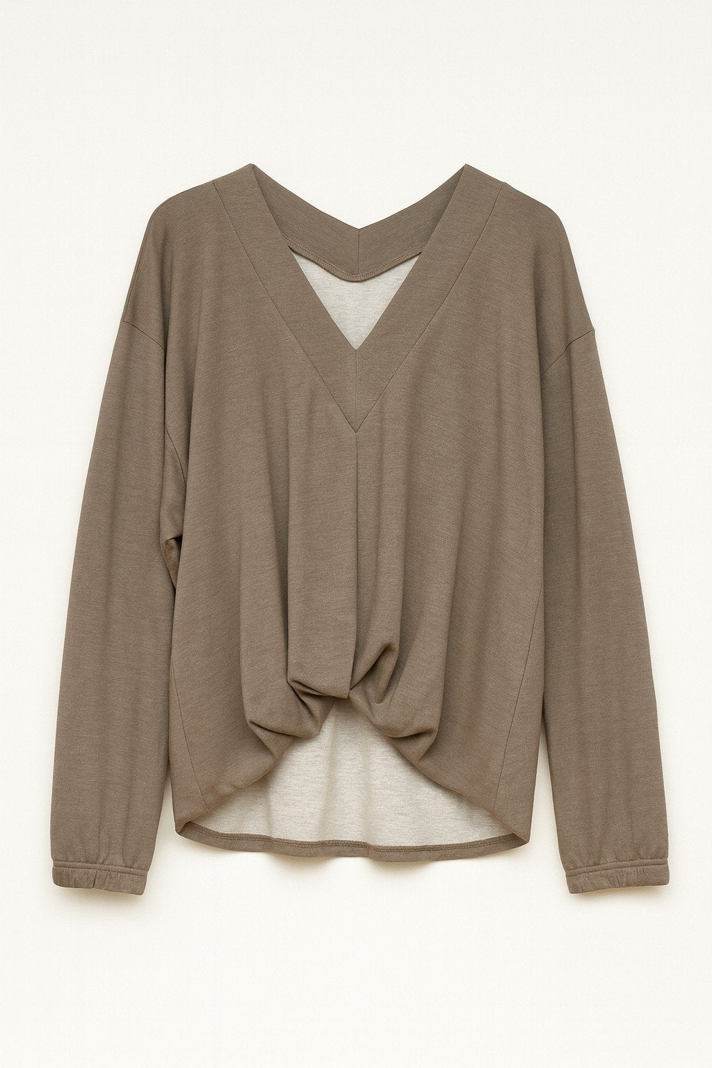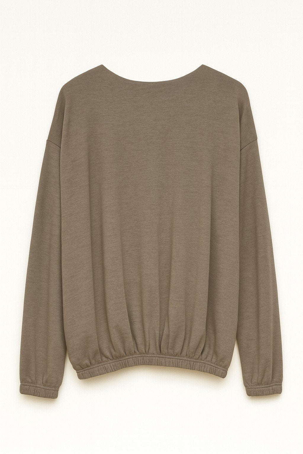 The V-neckline and gently gathered hemline create a flattering, feminine silhouette, while the elasticated cuffs add a touch of casual ease. Designed and produced responsibly in Greece, this piece embodies Milla’s philosophy of timeless style and conscious craftsmanship.