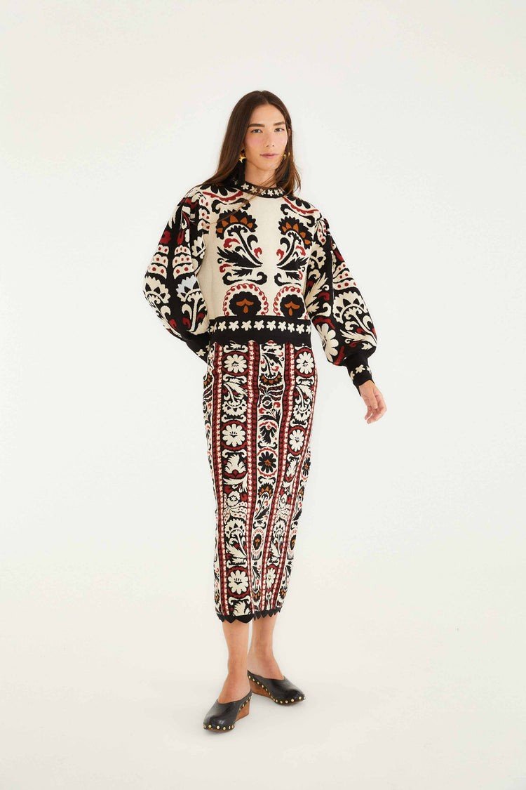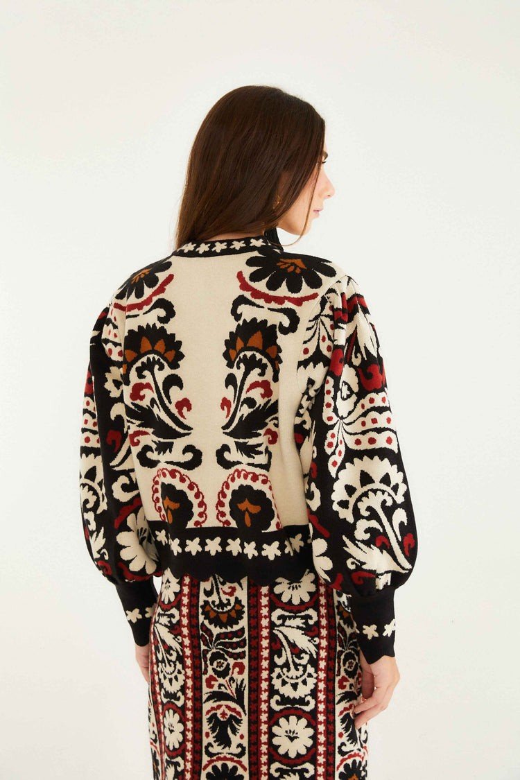 Embrace cozy elegance with the Stripes Winter Tapestry Knit Sweater by FARM Rio. Featuring a round neckline and voluminous puff sleeves, this knitwear masterpiece dazzles with its intricate tapestry-inspired motifs in warm hues of cream, black, rust, and red. The ornate patterns intertwine floral and abstract shapes, while the tailored silhouette and scalloped hem deliver a playful yet refined charm, perfect for embracing winter’s soft embrace in style.
