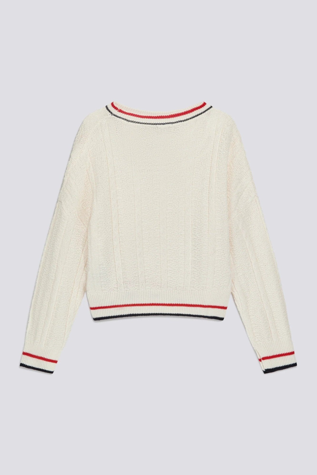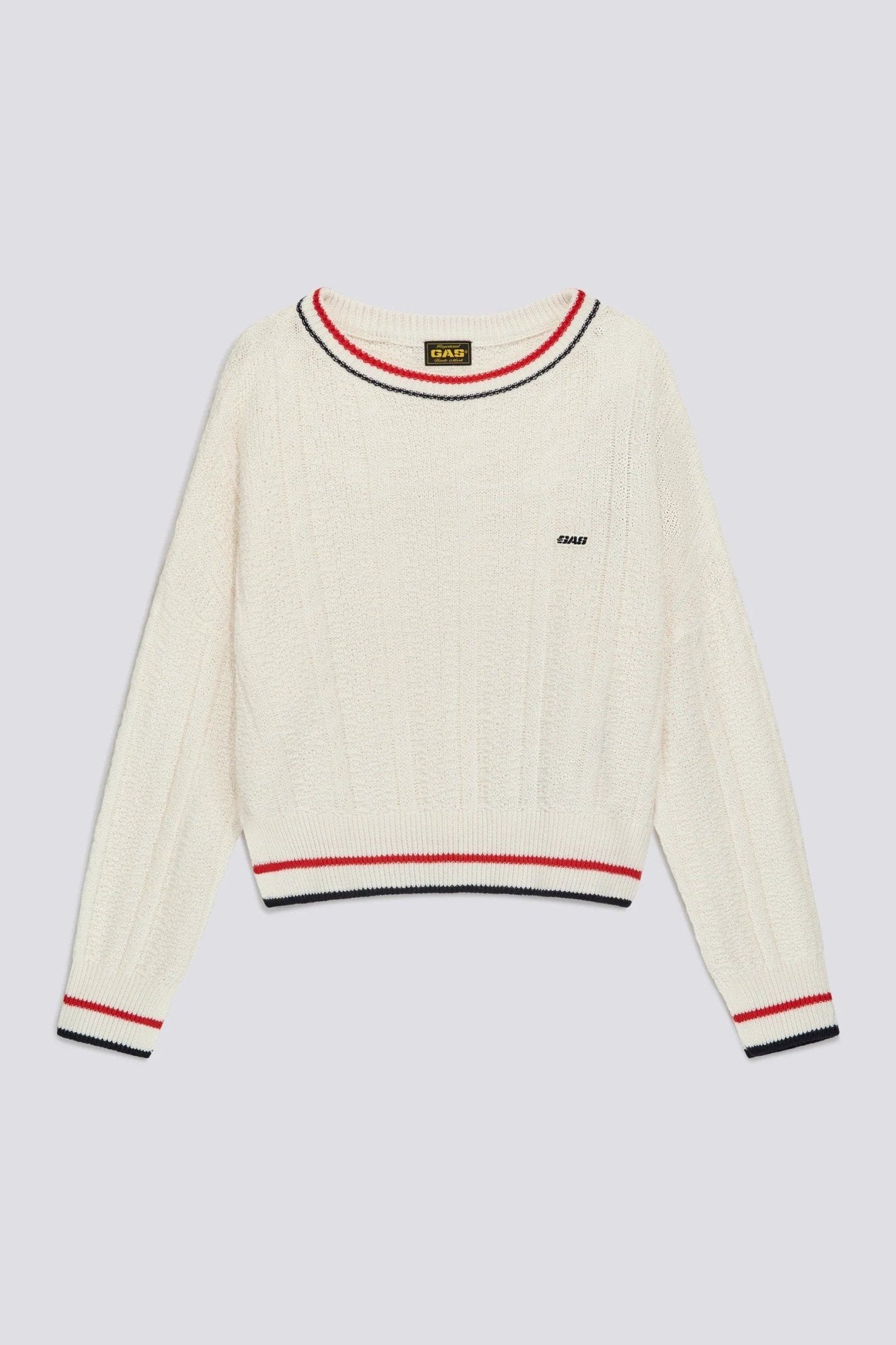 Women's crew-neck over-fit sweater in cotton and wool yarn, featuring a mix of knit stitches. The design draws inspiration from archival college aesthetics, with contrasting stripes on the collar, hem, and cuffs adding graphic definition to the silhouette. The textured knit offers added depth, while the relaxed fit makes it ideal for contemporary layering. The heritage patch on the chest completes the look with an authentic nod to GAS history.