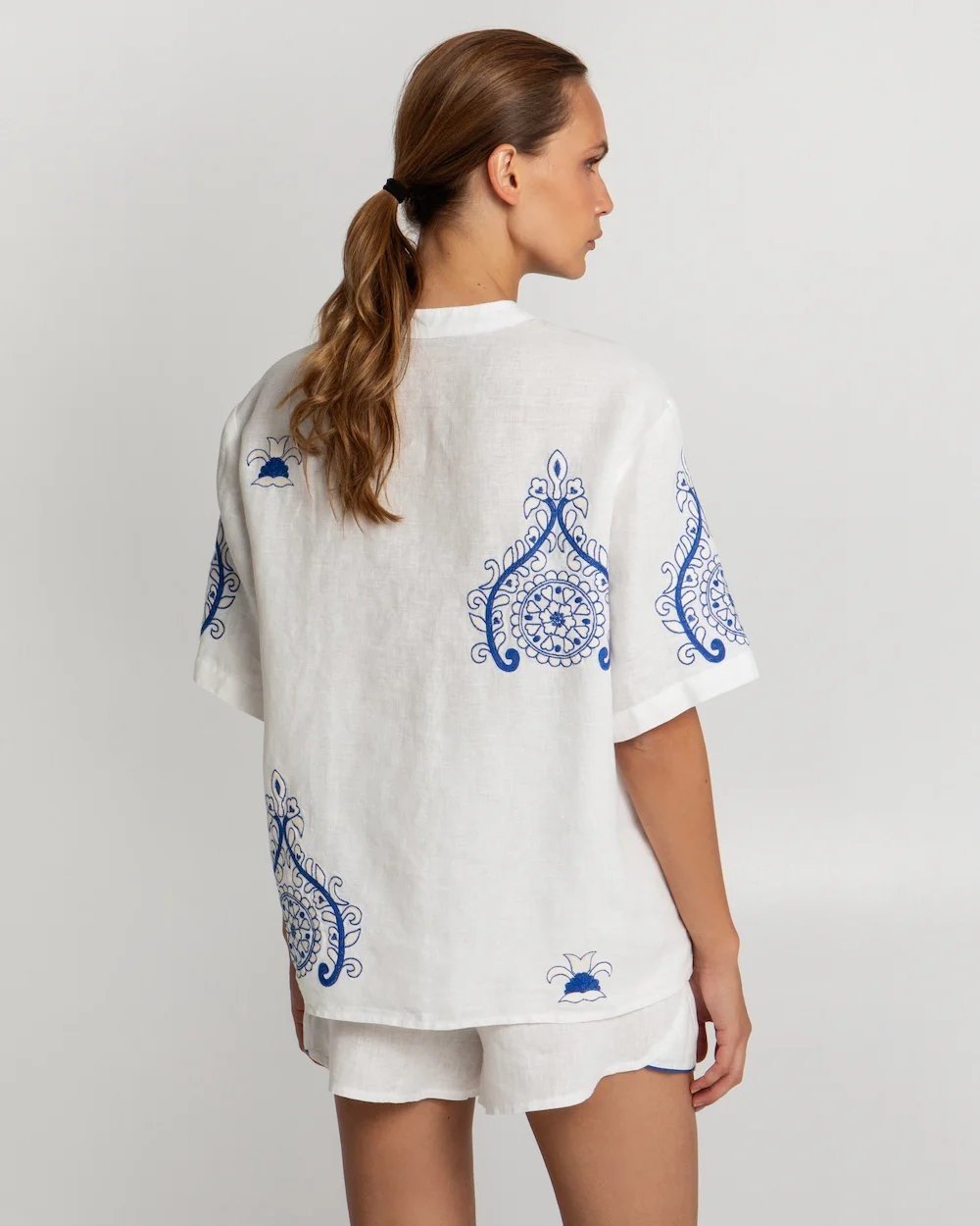 Crafted from pure linen for breathability and comfort, it features intricate cobalt blue embroidery arranged in symmetrical botanical and geometric motifs. The boxy, oversized silhouette with short sleeves and a stand collar adds a relaxed sophistication, perfect for balmy days by the sea or a refined city stroll.