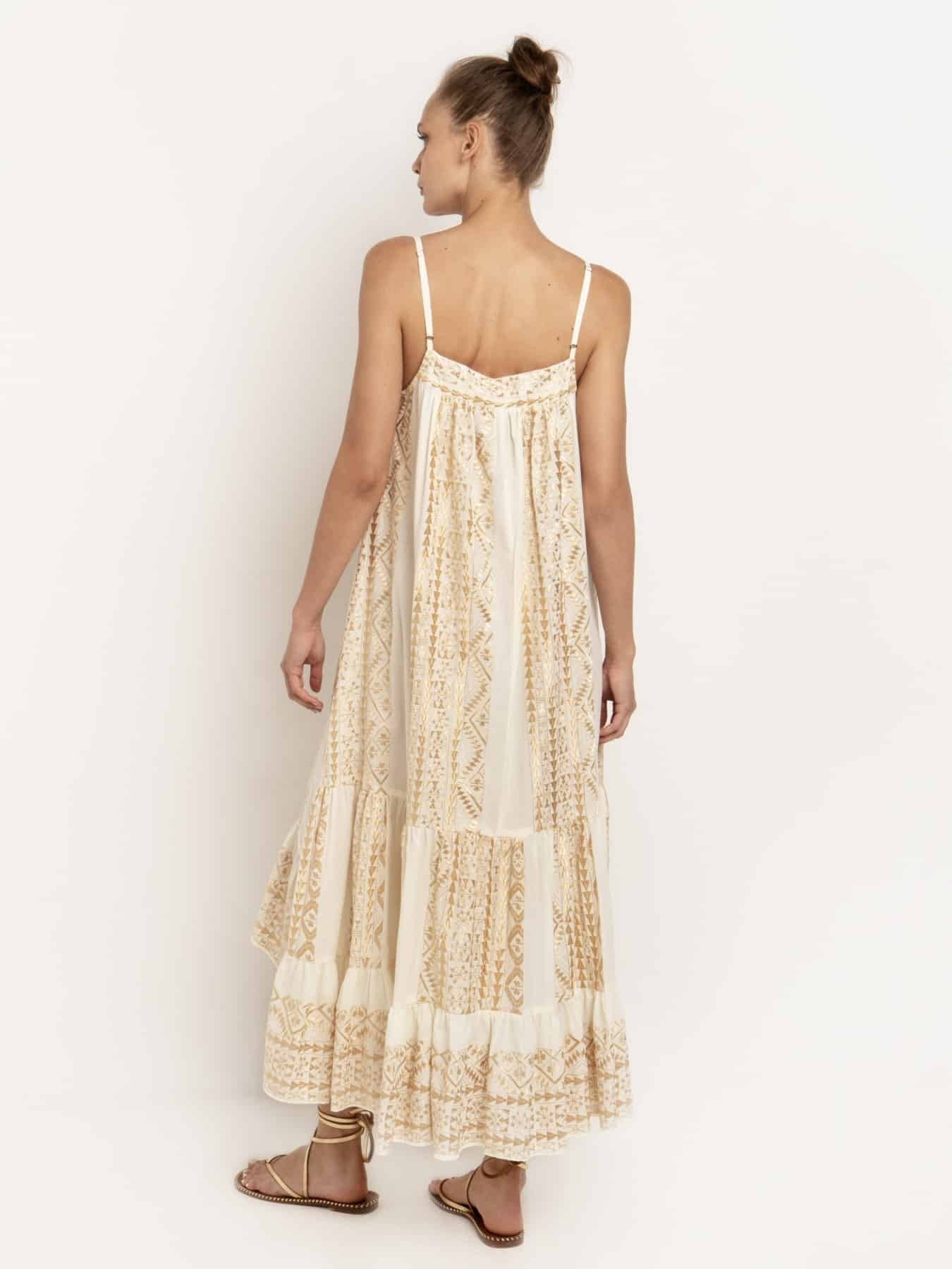 Bask in the golden glow of summer with the Sahara Breeze Maxi Dress. Inspired by Mediterranean landscapes and artisanal embroidery, this flowing silhouette captures the essence of effortless elegance. Crafted from 100% cotton, it features fine golden thread embroidery in geometric and tribal motifs, adding texture and sophistication to every step.