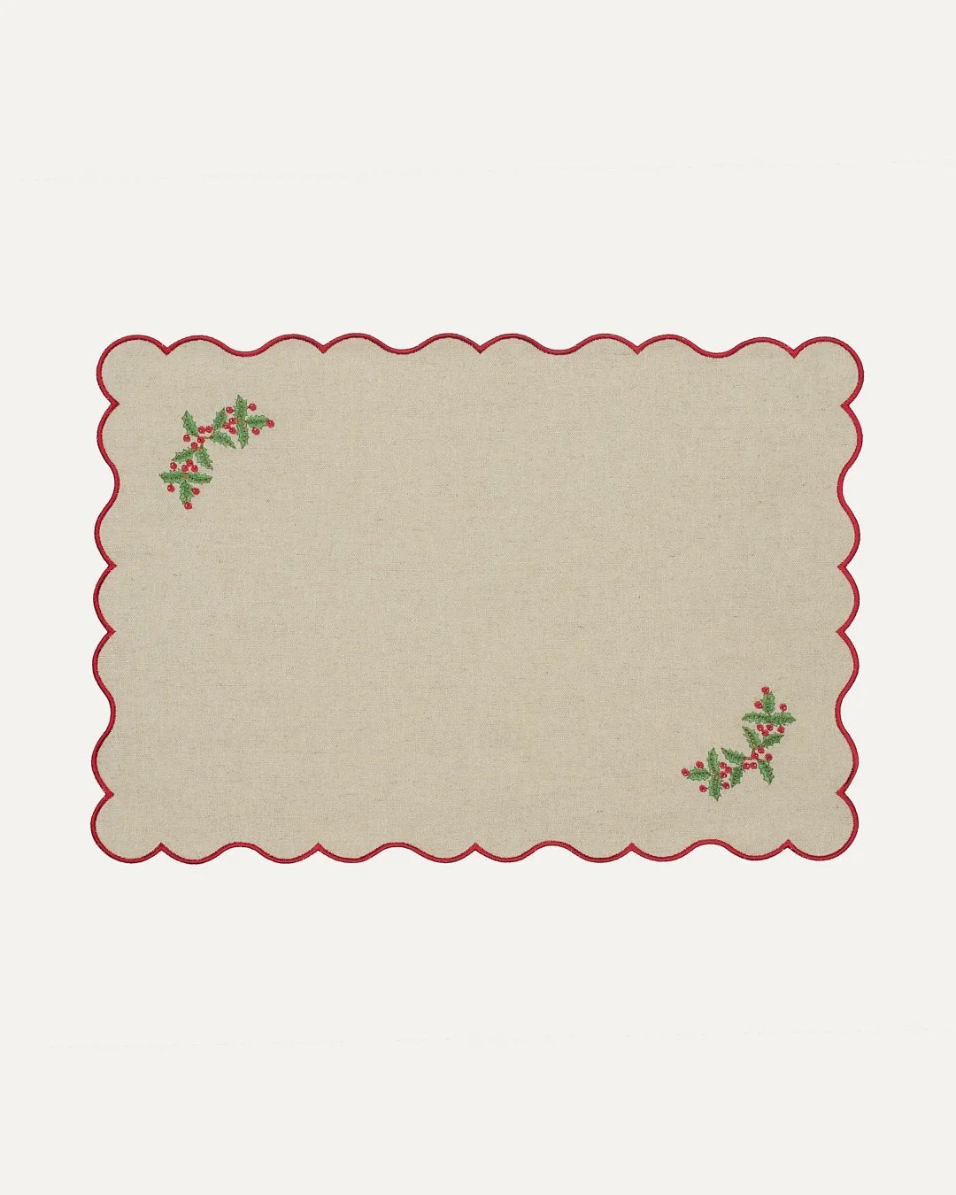 Detail: Embroidered holly and red border, ideal for the Christmas season