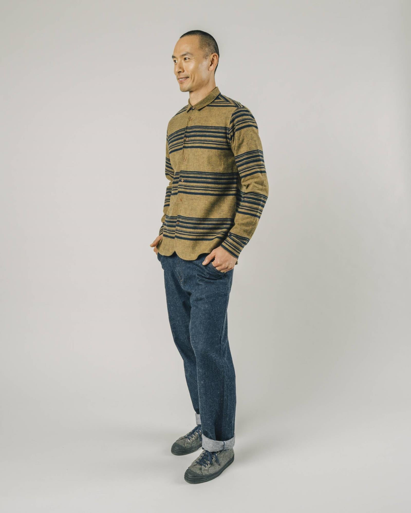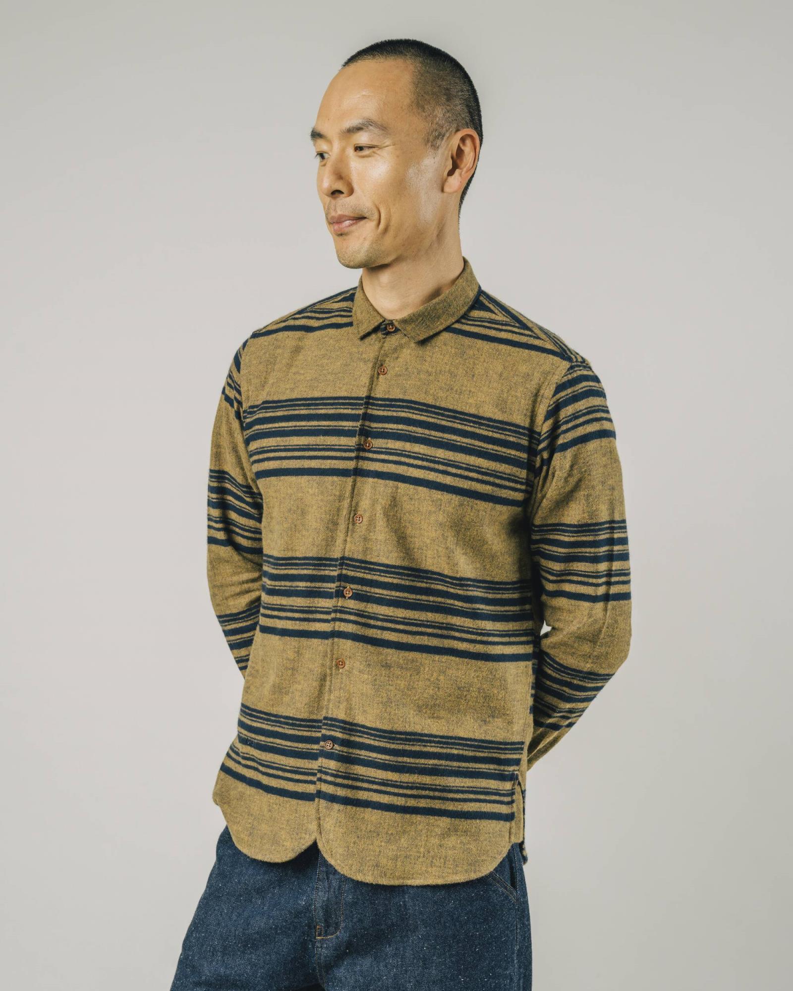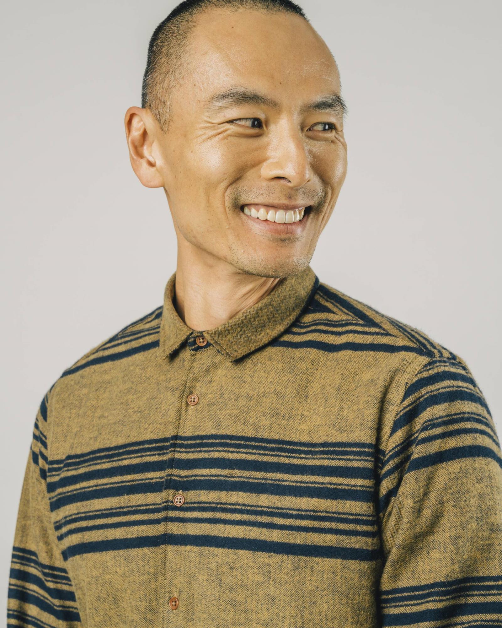 The perfect solution for every ocassion. This shirt in timeless mustard shade with horizontal, dark blue stripes can take you from the office straight into whatever adventure is waiting up ahead. It can be worn buttoned up as a shirt or thrown over a T-Shirt for a relaxed look.