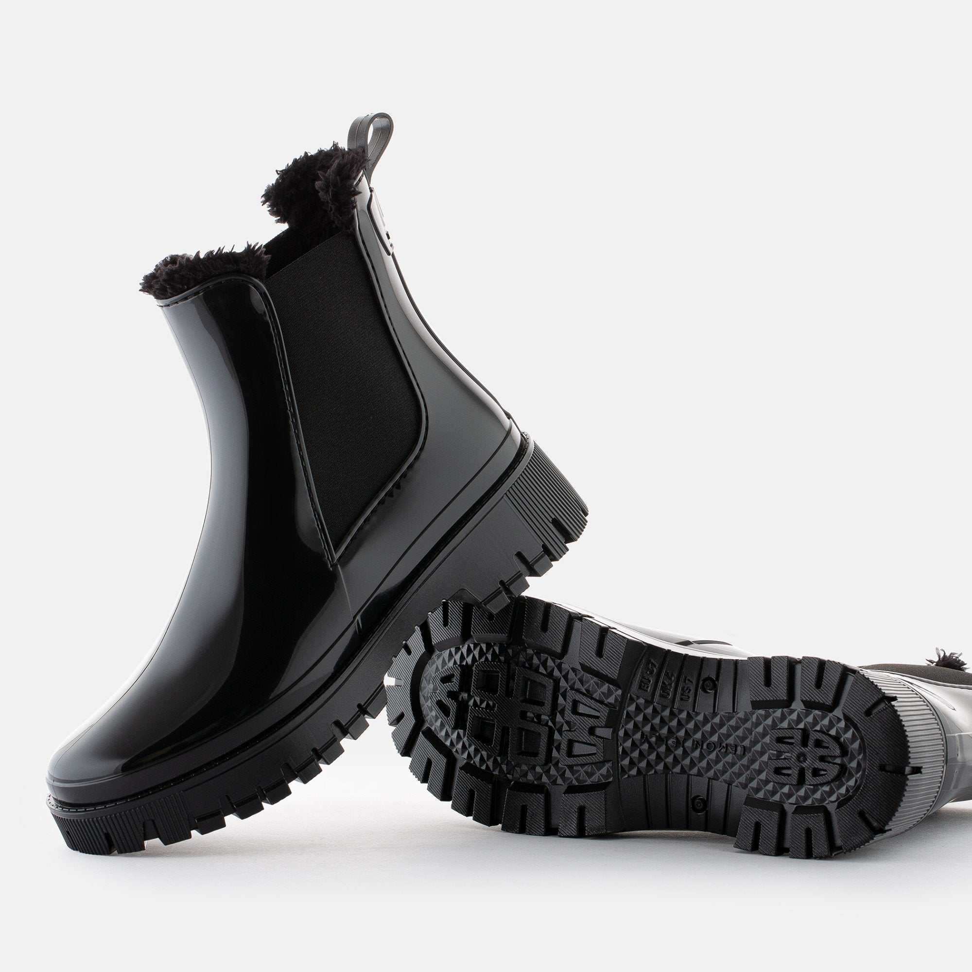 A black boot is always essential in any season, but these rain warm boots have a special synthetic fur lining thought for the coldest winter days. Feel the comfort of a wider fit and the warm interior of these wellies and prepare your trendiest winter looks. Produced with recycled materials in a factory in Portugal powered by renewable electrical energy for a step ahead in sustainability. Vegan and lemon scented as always.