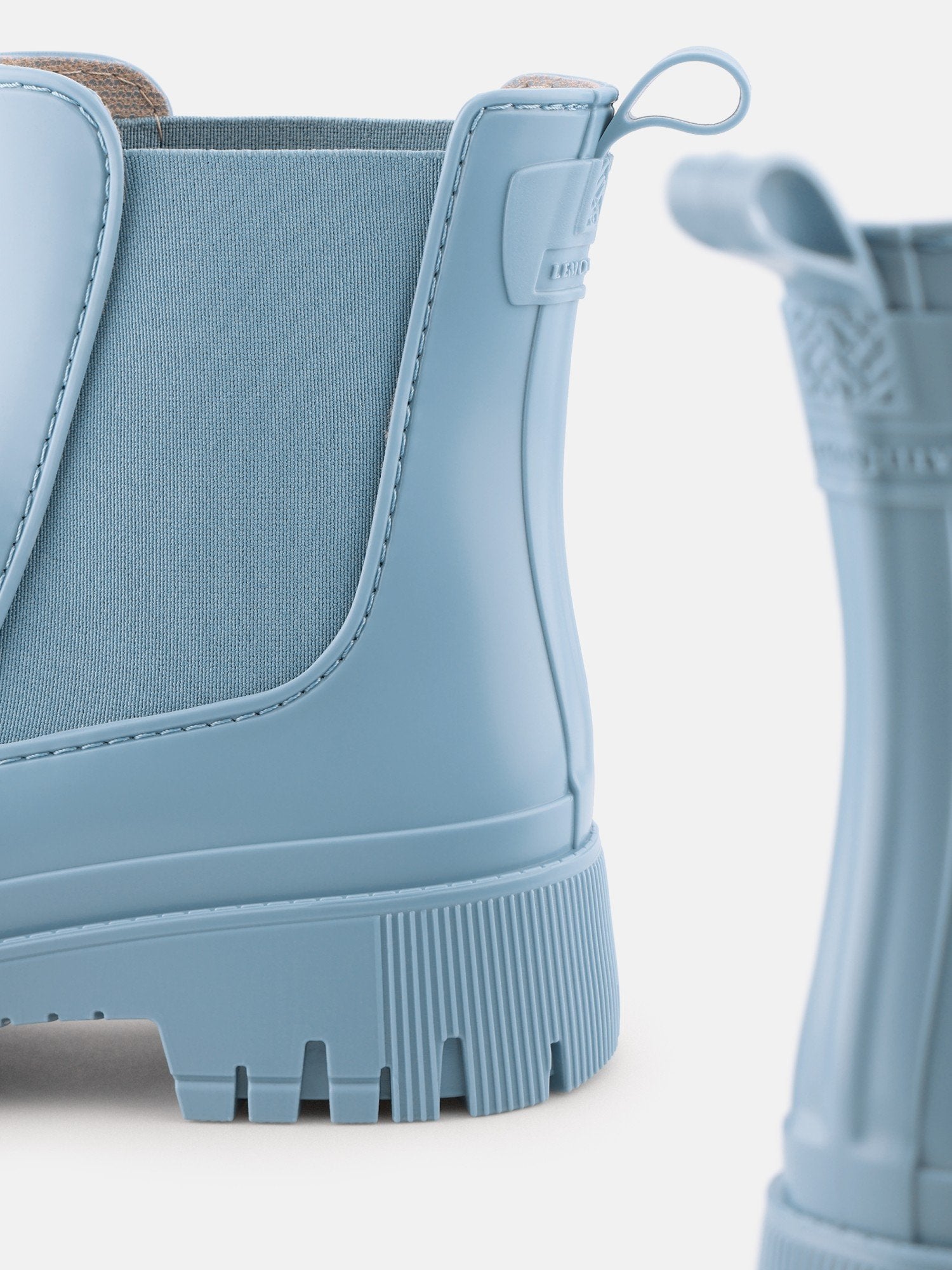 These blue matte boots bring a cool modern touch to layered dressing. Let them match a casual suit for an office look with personality, or pair with a long wool tunic for weekend wanderings. Vegan and crafted in Portugal with 100% clean energy, featuring breathable insoles and our playful lemon scent.