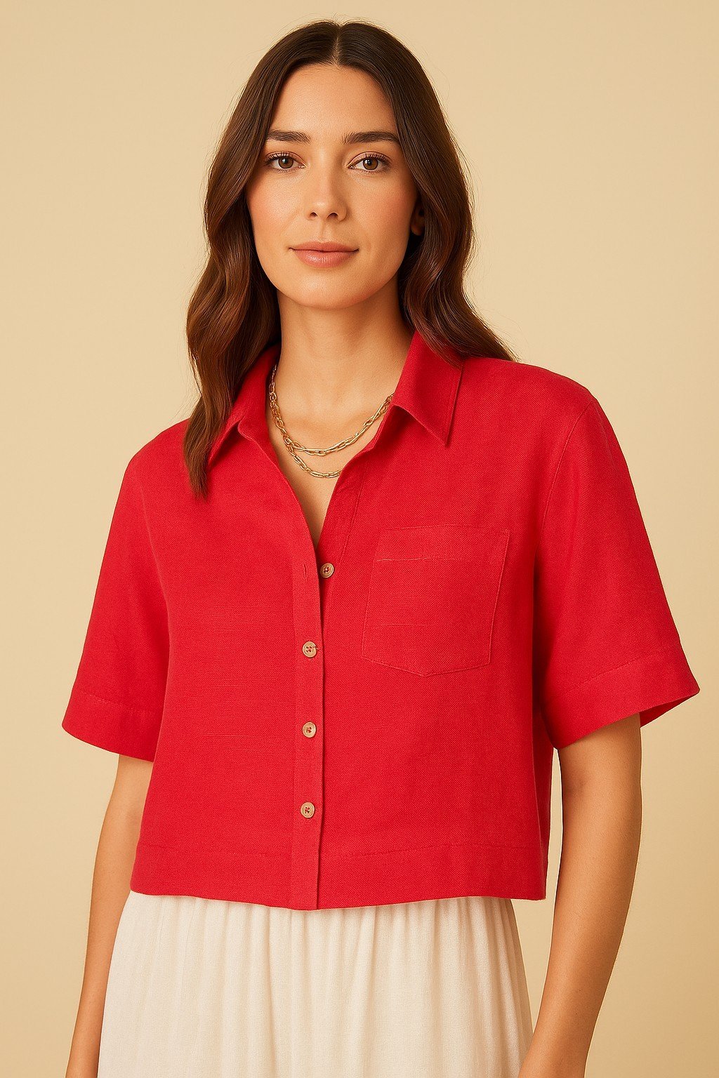 Cut in a slightly cropped silhouette, the blouse features a soft open collar, short sleeves, and a neat button placket adorned with four light wood buttons—adding a warm, organic accent. A single chest pocket brings relaxed sophistication, while the fine texture of the linen elevates the entire look.