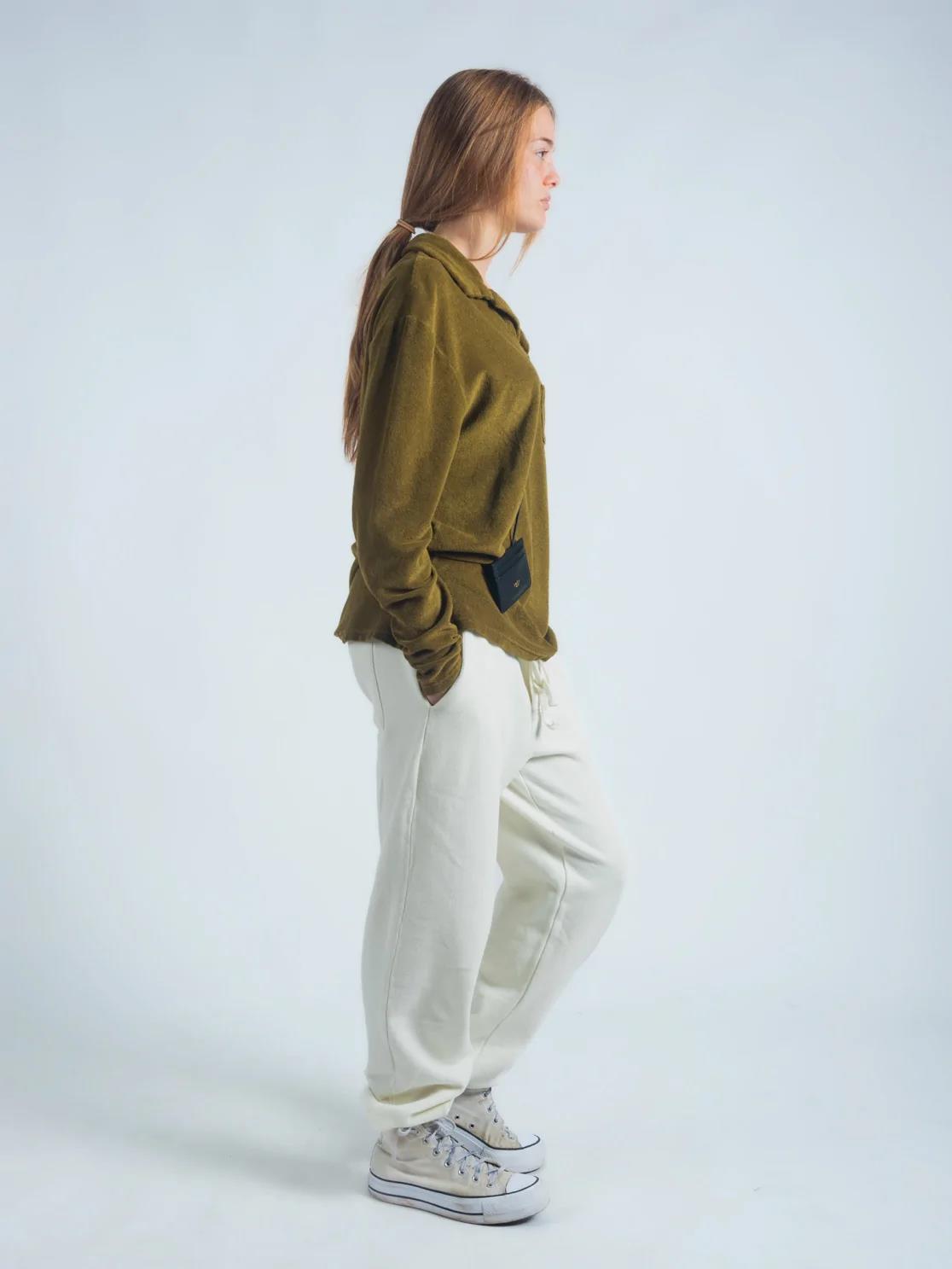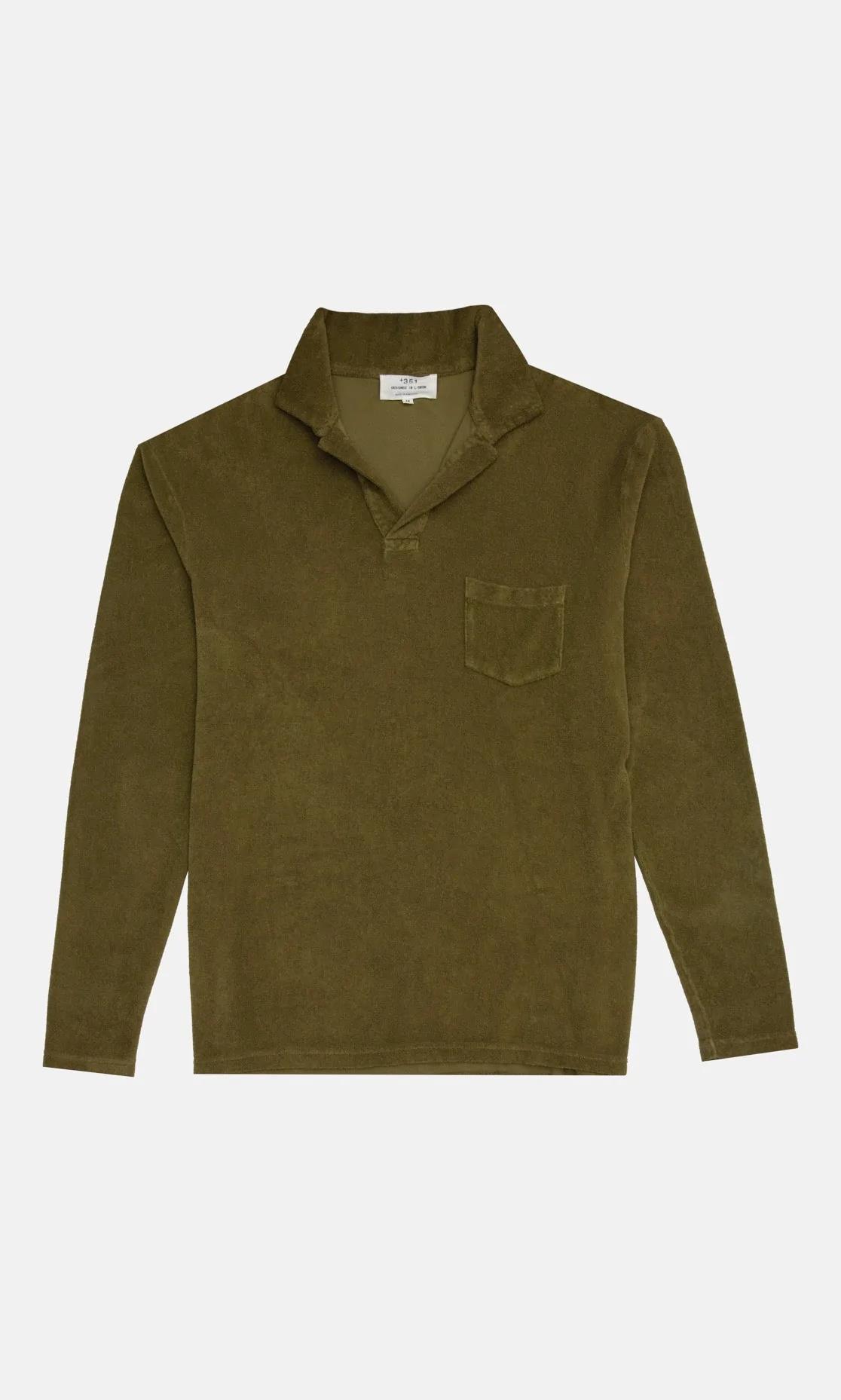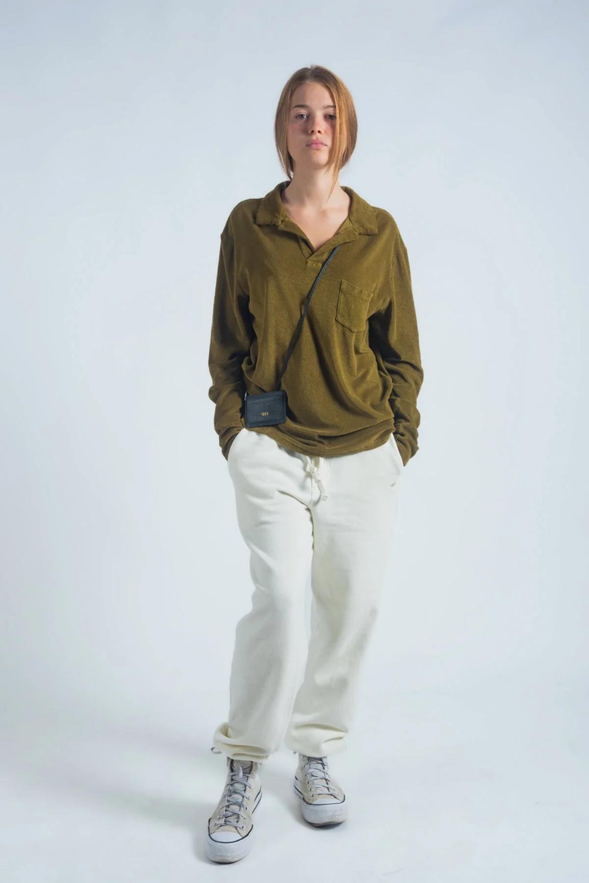 In this piece, we wanted to take the classic polo shirt and give it a contemporary twist with our towel-like Terry fabric. This piece is cut from cotton terry, which is both absorbent and has a smooth feel on the skin.