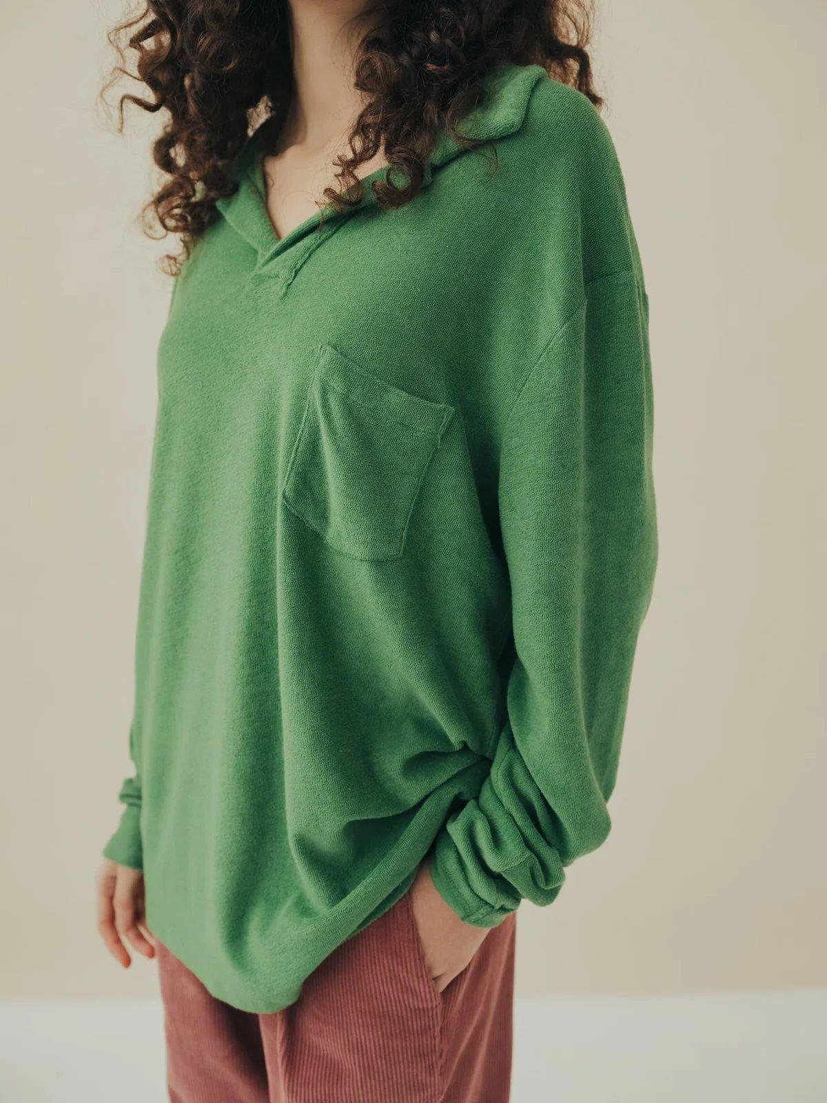 In this piece, we wanted to take the classic polo shirt and give it a contemporary twist with our towel-like Terry fabric. This piece is cut from cotton terry, which is both absorbent and has a smooth feel on the skin.