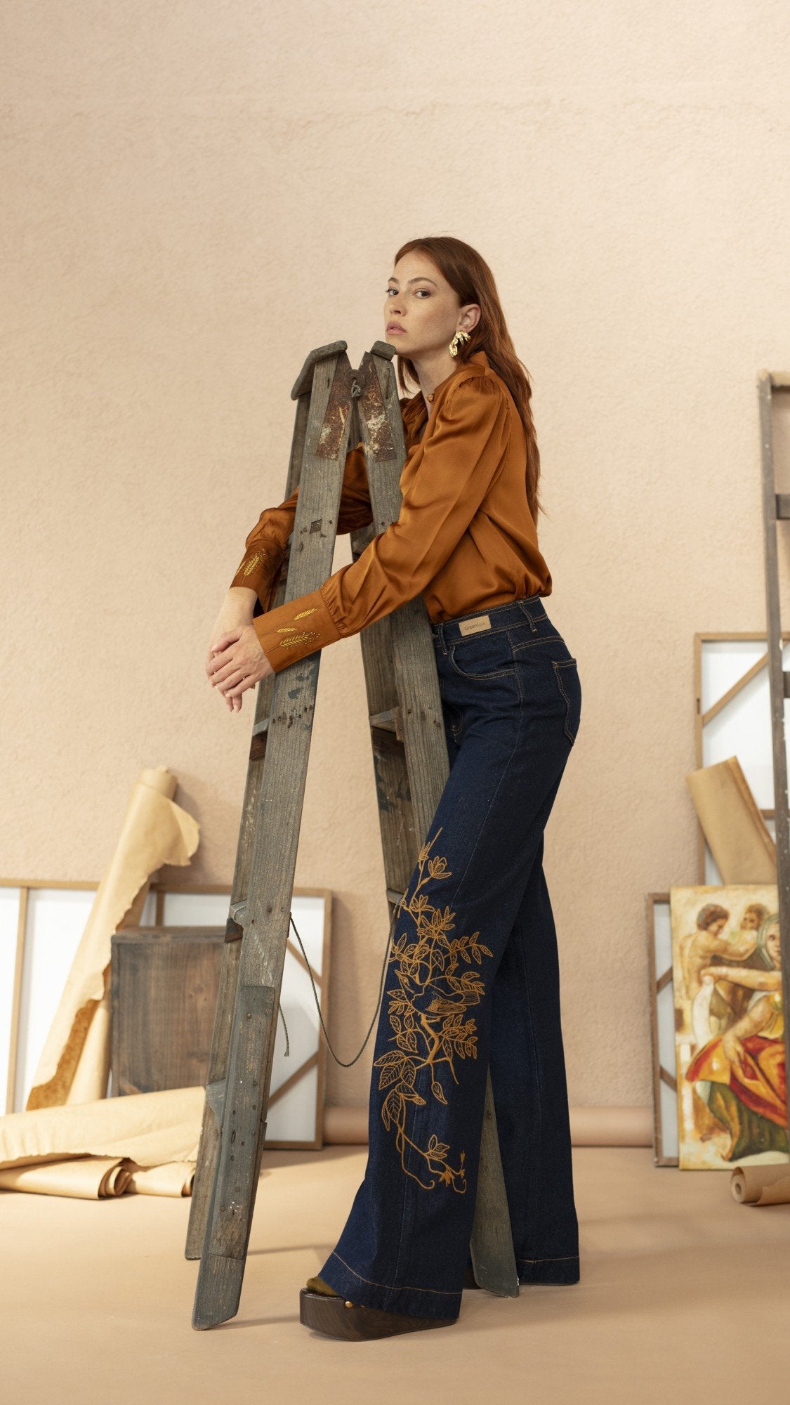 The standout feature lies in the exquisite floral embroidery adorning one leg — a nod to Portuguese artistry and the beauty of nature, delicately executed in contrasting golden thread. Details such as belt loops, a button and zip closure, and classic five-pocket styling complete the look, blending practicality with refined charm.