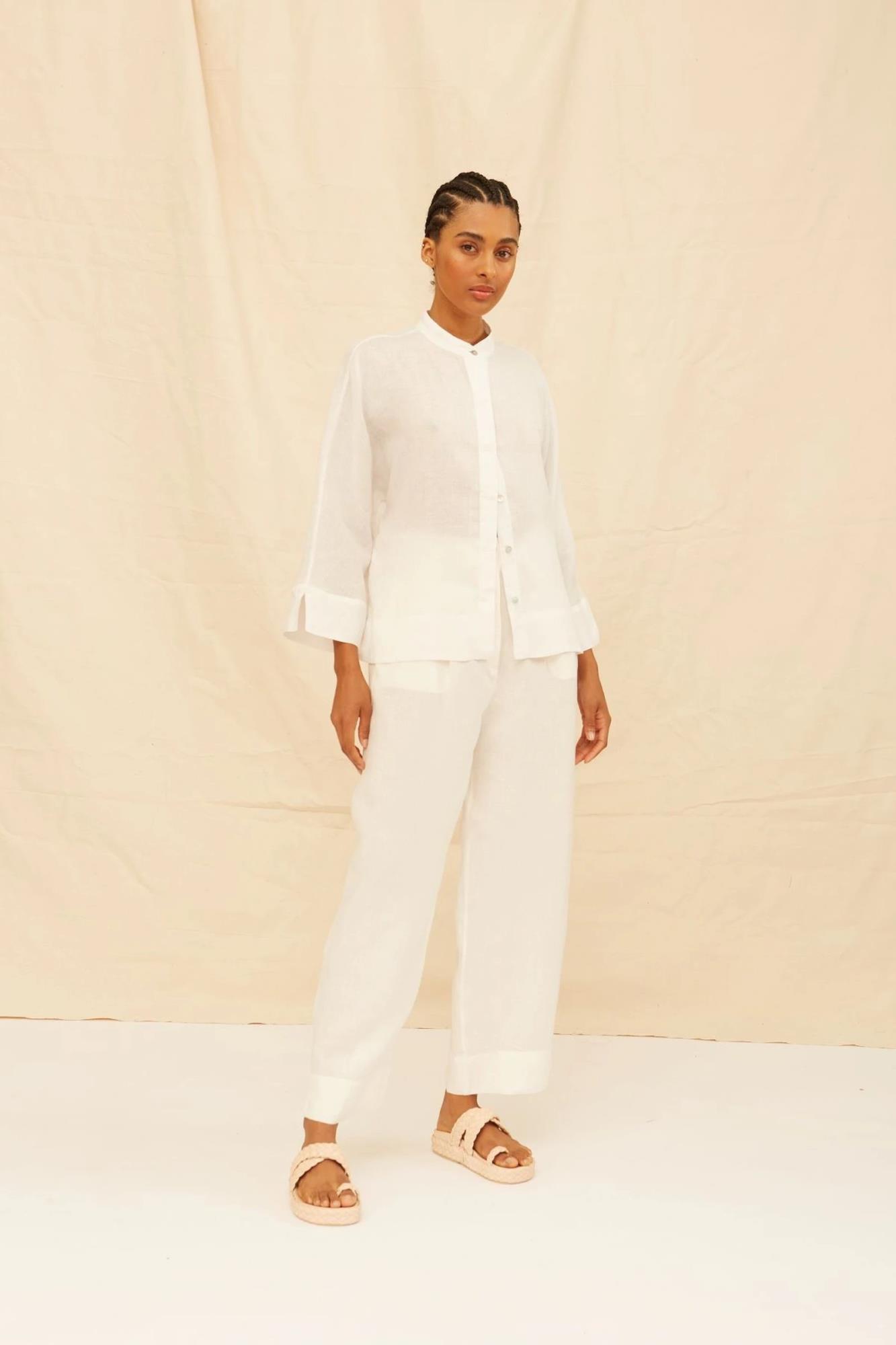 Loose fitting shirt with 3/4 sleeves and side slits. Subtle A-line cut, stand-up collar and button closure with inlaid view.