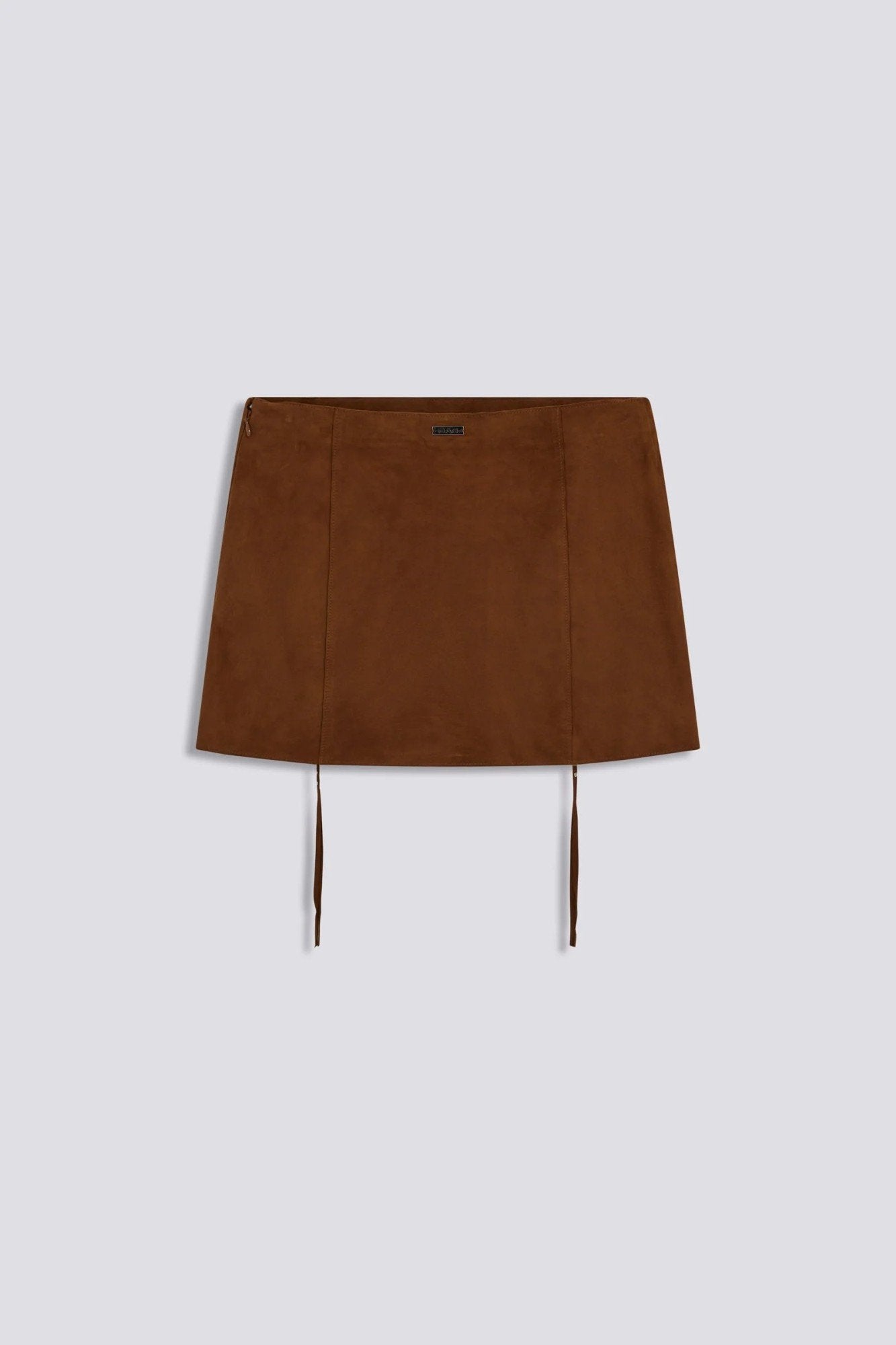 Women’s regular-fit short skirt in suede leather. Unlined model with a minimalist design, featuring a blind stitch detail on the front that enhances the garment's structure. The design is finished with a metal logo plaque applied on the back. A bold and clean piece, designed to add character to the summer wardrobe with an authentic and contemporary aesthetic.