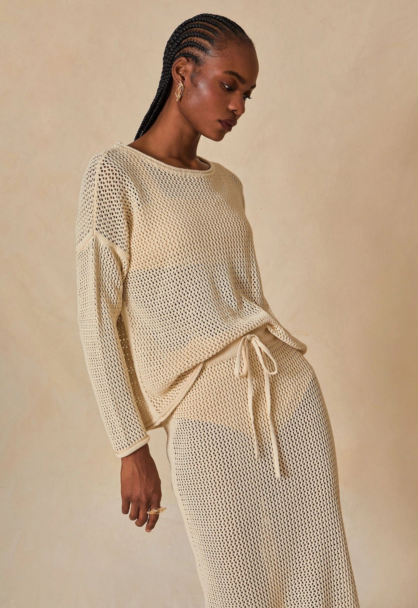 Rooted in artisanal craftsmanship and conscious design, the Suzana Midi Skirt by Flávia Aranha is a refined expression of comfort and sustainability. Made from 100% organic cotton yarns, this hand-knitted piece brings soft structure and timeless elegance to everyday wardrobes.