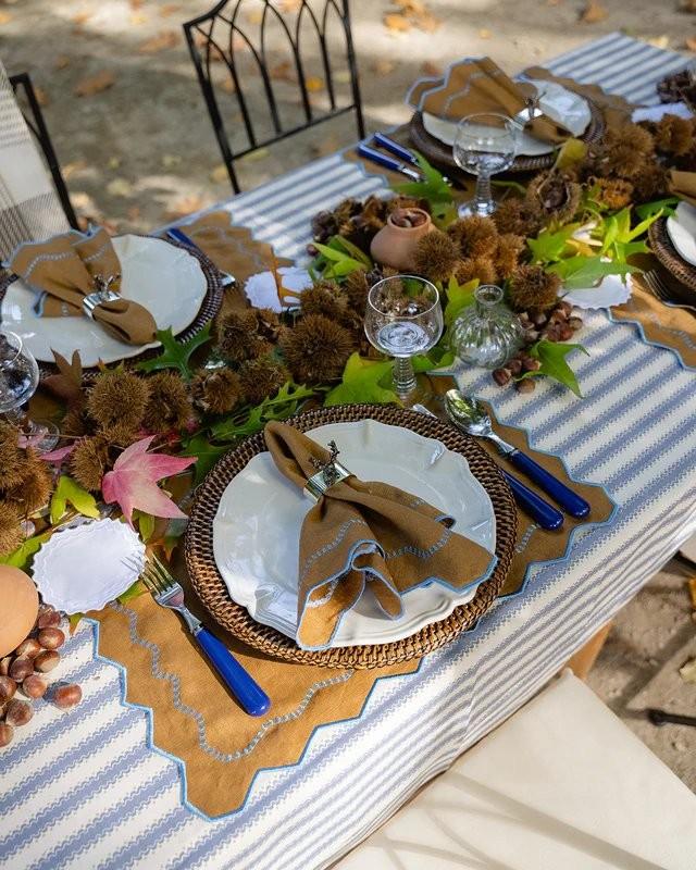 Dining styling shouldn''t feel like a chore; it should be an extension of your personal style. The Alba placemat brings an immediate sense of character to your table setting, softening the hard lines of wooden or glass surfaces with its organic, scalloped silhouette. The earthy brown linen base grounds the look, while the light blue embroidered trim adds a subtle, vibrant lift. Crafted from a breathable, natural linen-cotton blend, this piece is a durable choice that respects the planet while making your morning coffee or evening dinner feel just that little bit more special.