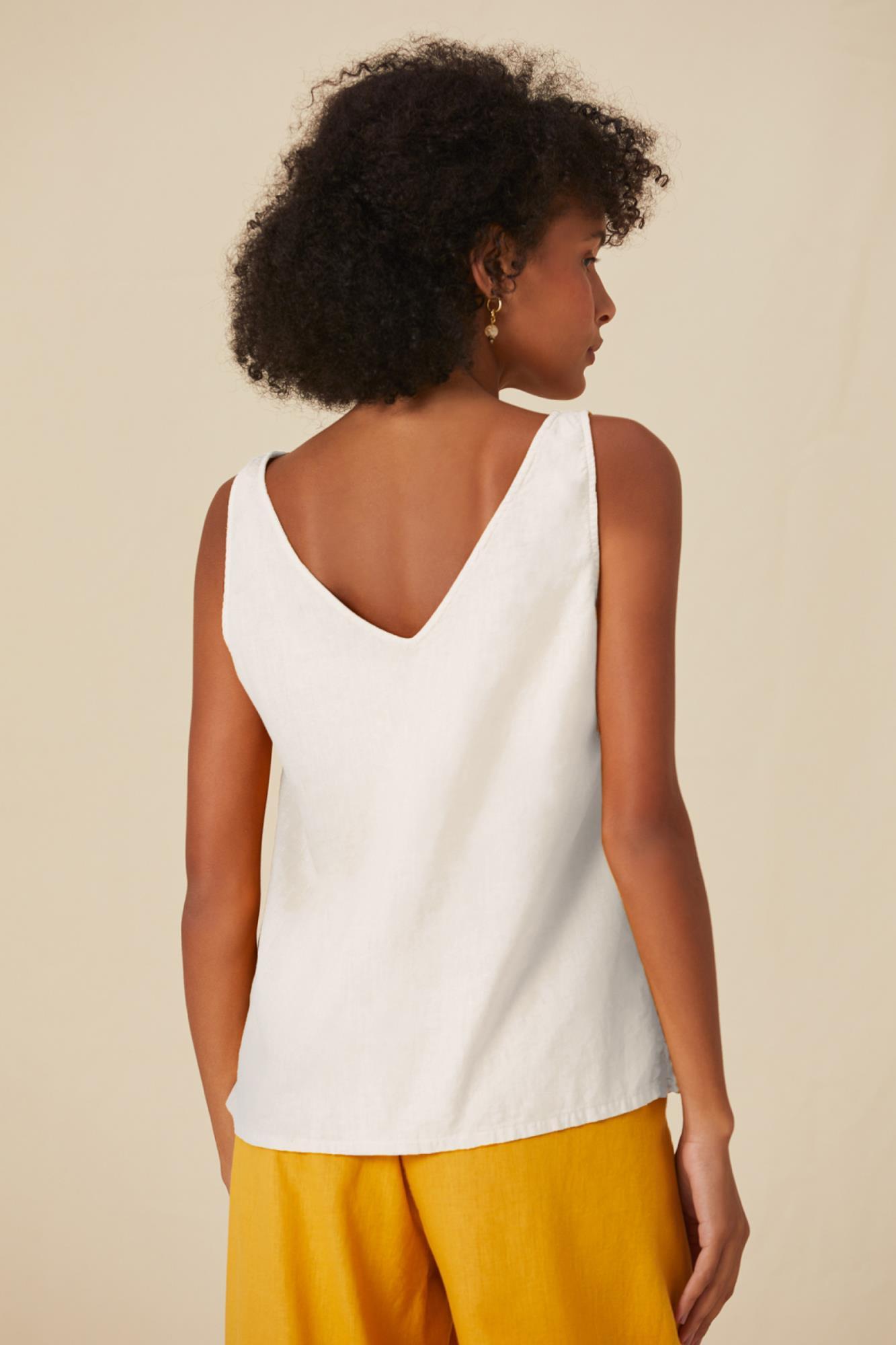 A tank top made of flat linen viscose fabric. Pleasant touch and great fit. Rustic and fresh look, very characteristic of the natural fibre. Loose-fitting model. V-neckline, front and back.
