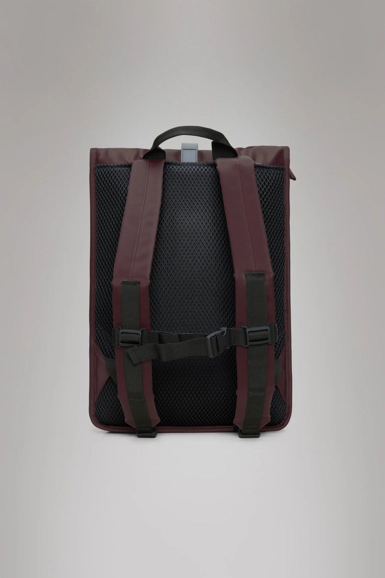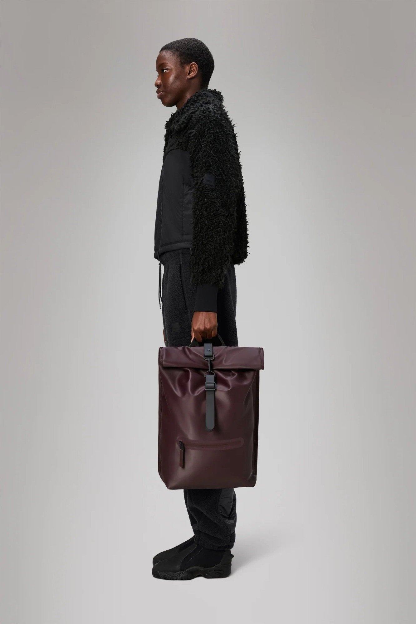 Rolltop Rucksack is cut in Rains’ signature waterproof PU fabric, engineered for carrying strength, durability, and a smooth feel.