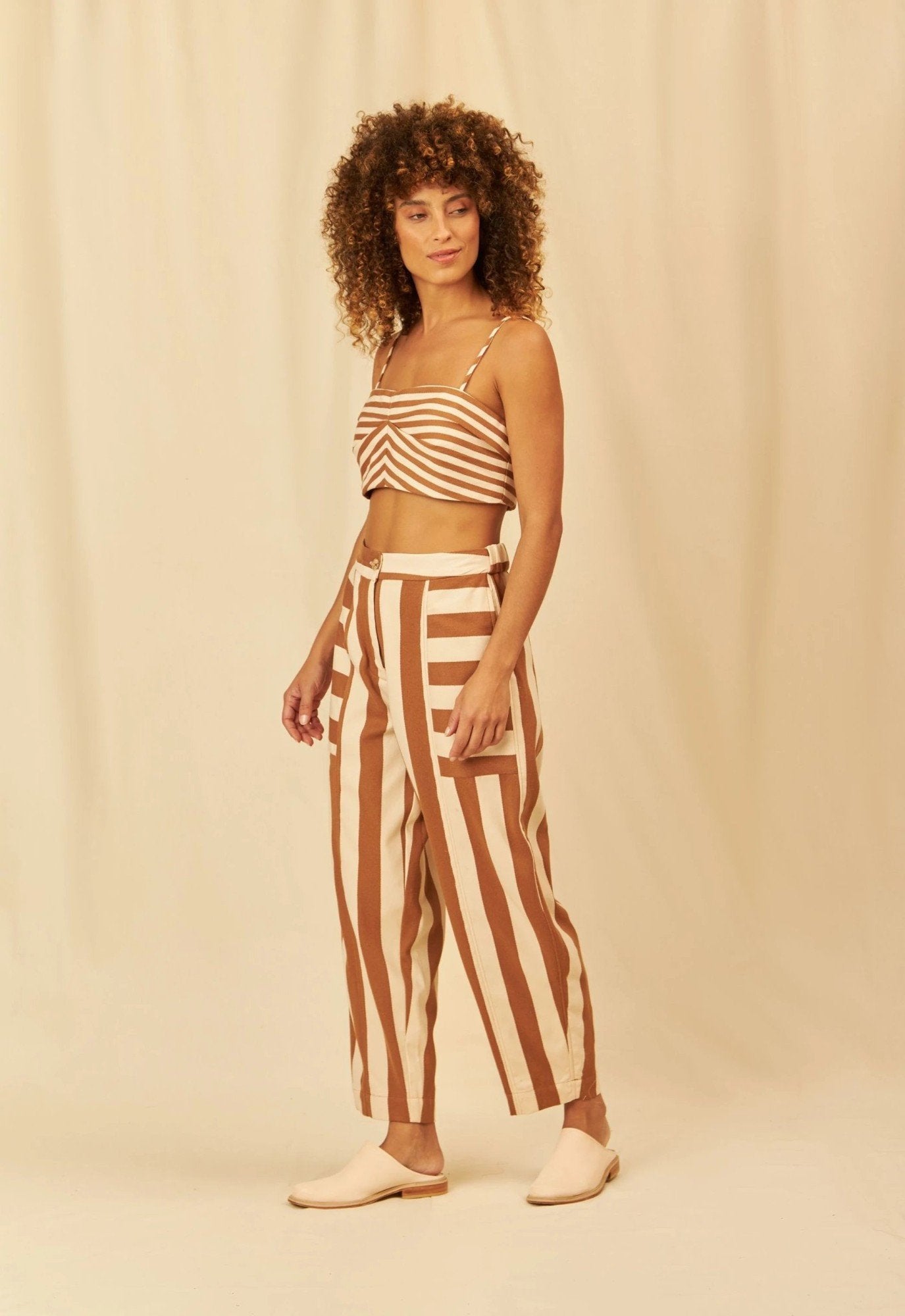Featuring a delicate square neckline with architectural pleats and thin straps, this top offers a gently structured bust and an elasticated back for a flexible, comfortable fit. The striped fabric, in soft shades of off-white and earthy ruby brown, tells a deeper story: it’s made from 100% organic cotton grown and harvested in partnership with Rede Borborema, a Brazilian agroecology network committed to biodiversity and family farming.