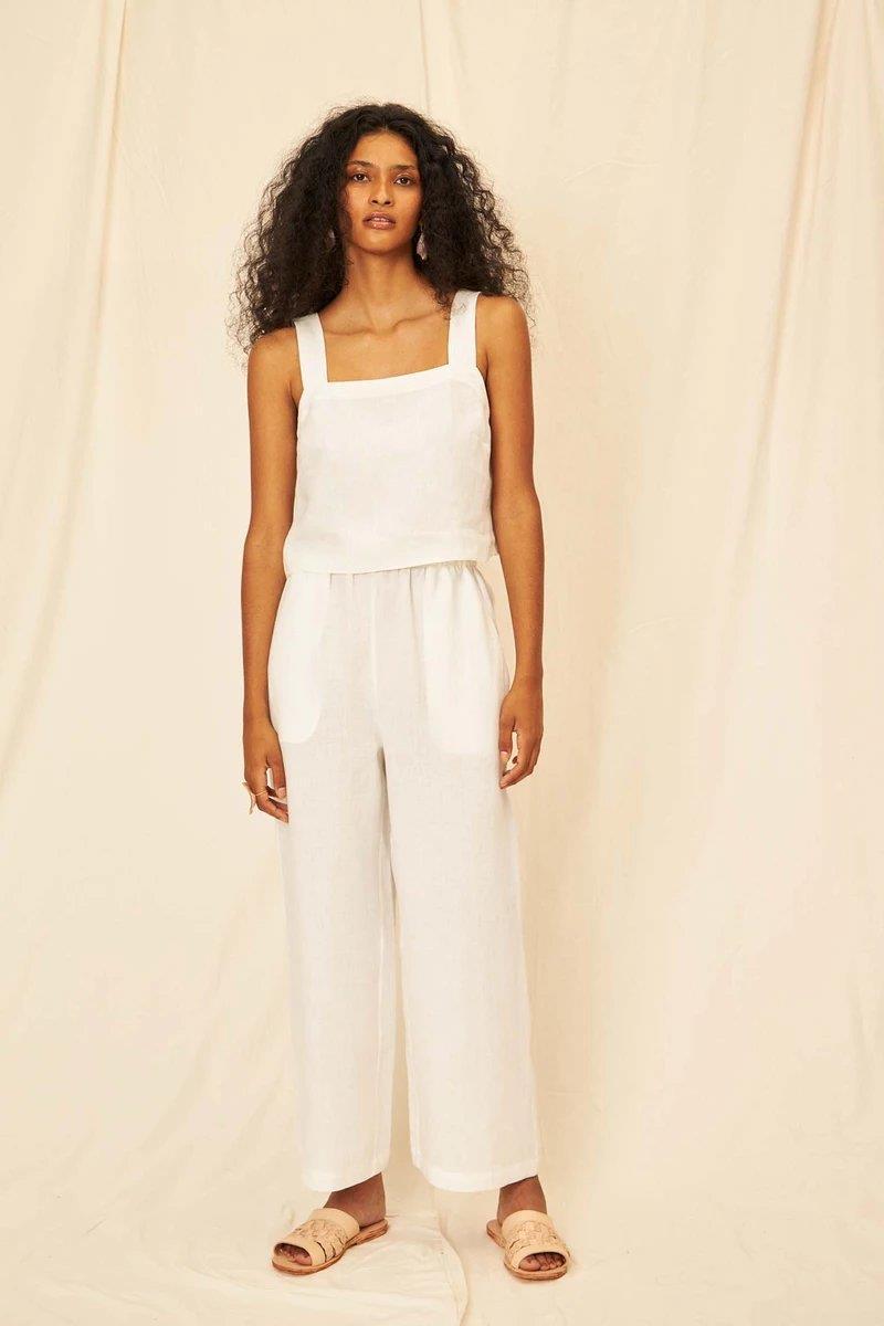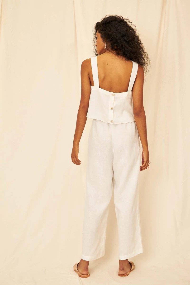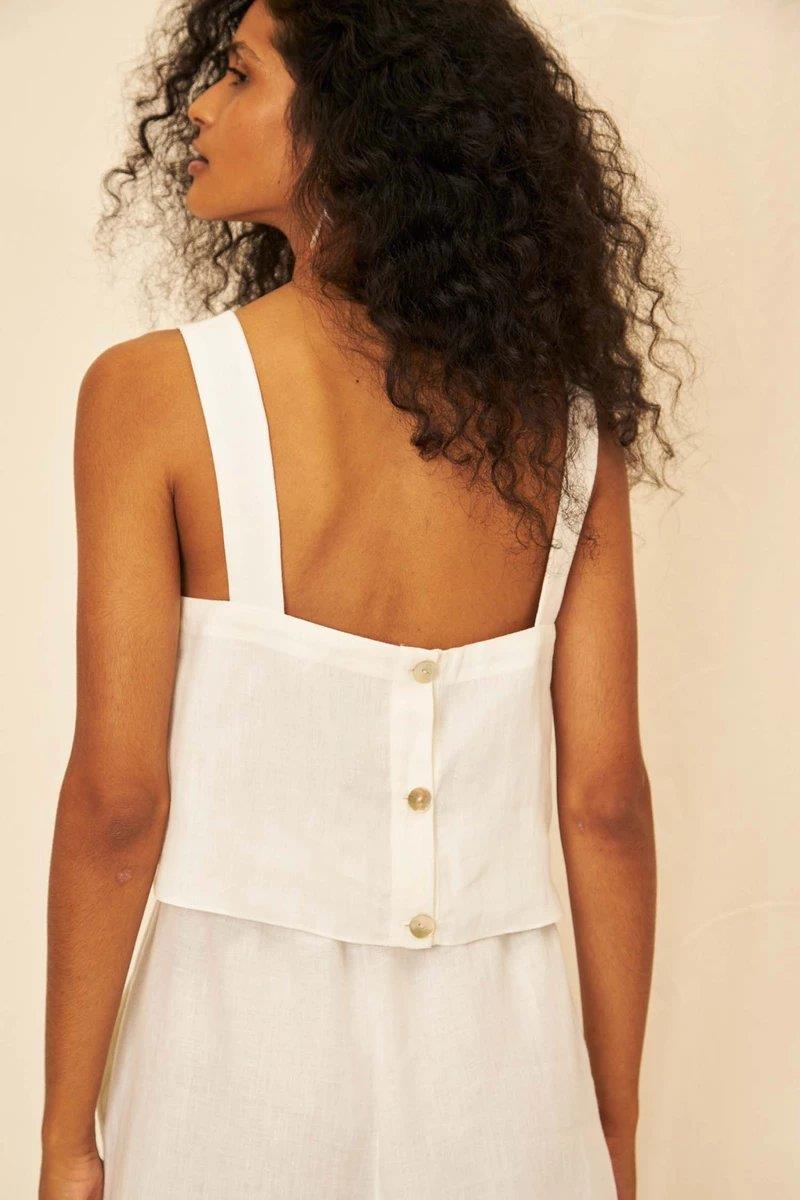 Straight blouse, shorter model, wide straps, straight front neckline, with back closure and mother-of-pearl buttons. Made from 100% linen, a naturally sustainable fibre that does not require the use of pesticides or irrigation water.