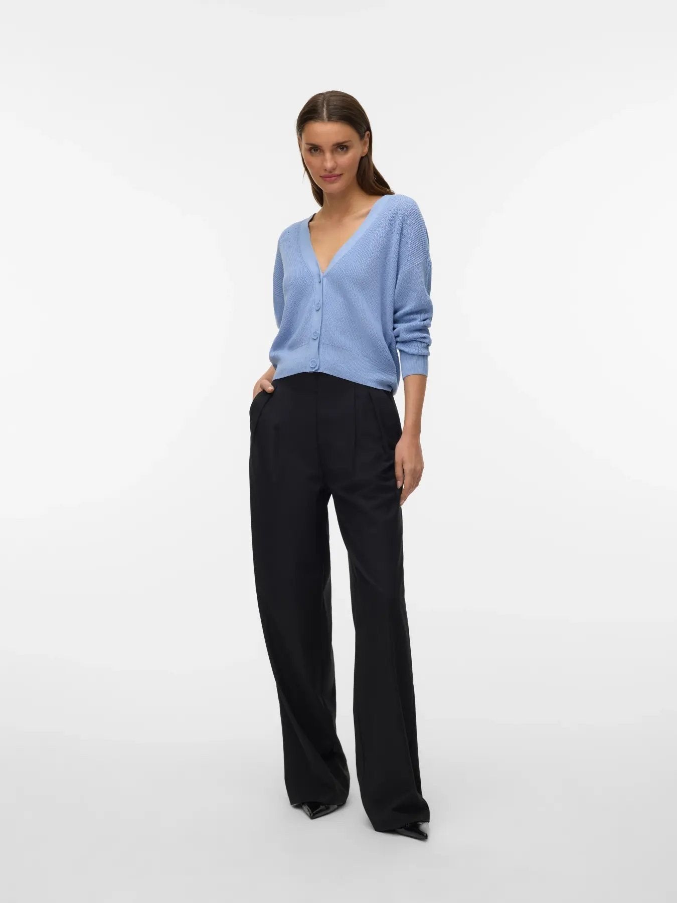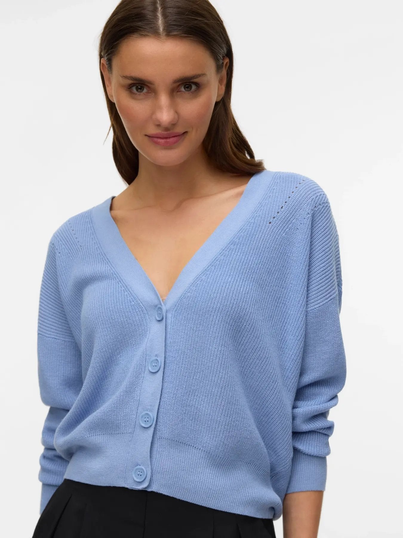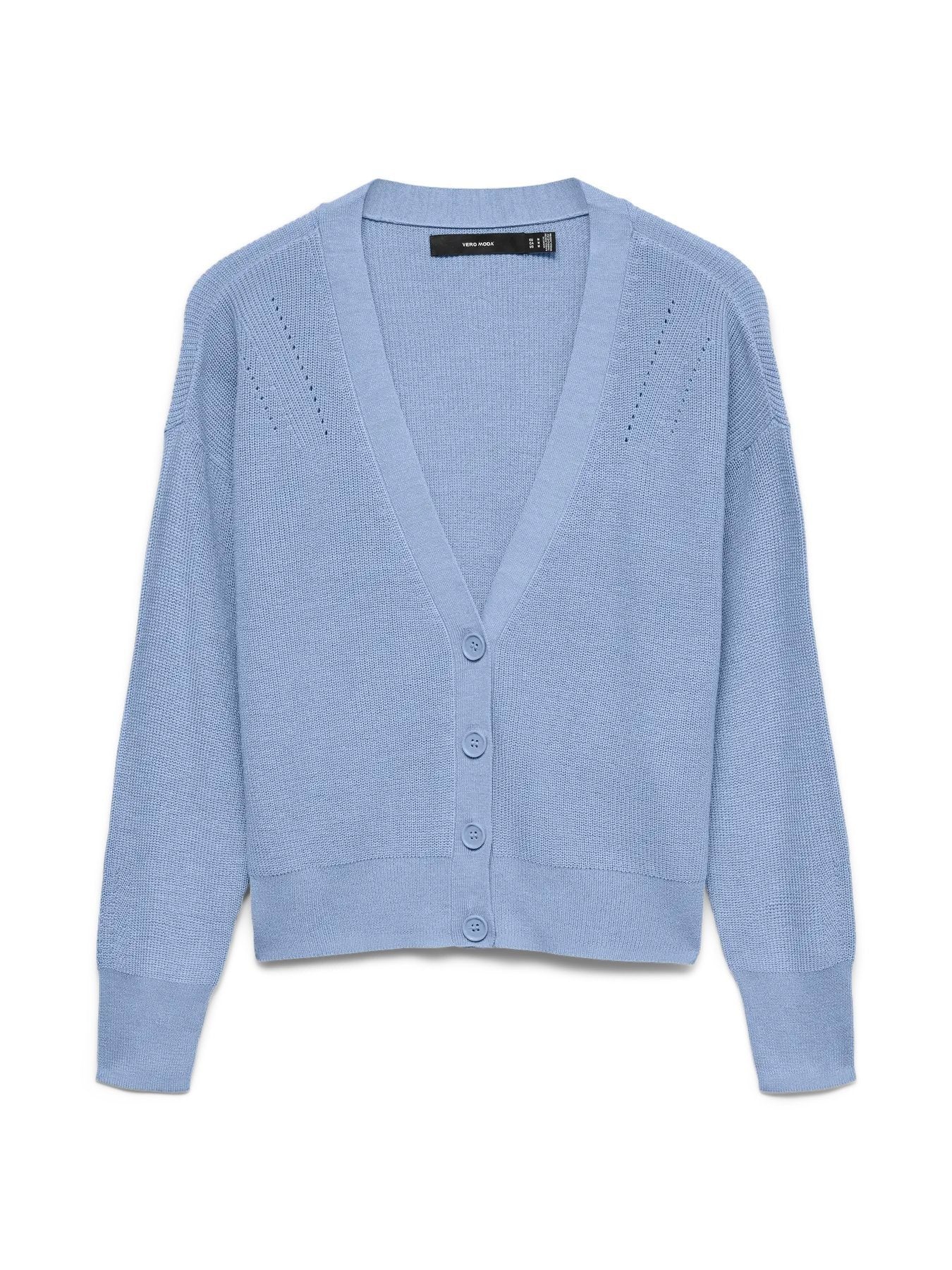 Die Mischung aus 50 % LENZING™ ECOVERO™ Viskose, 25 % Acryl und 25 % Baumwolle sorgt für einen Stoff mit einem weichen, fließenden Fall, der natürlich von den überschnittenen Schultern fällt. Die Flachstrickkonstruktion verleiht ihm ein raffiniertes, leichtes Tragegefühl, ohne aufzutragen. Ein V-Ausschnitt und ein Knopfverschluss runden eine Silhouette ab, die sowohl entspannt als auch elegant ist.