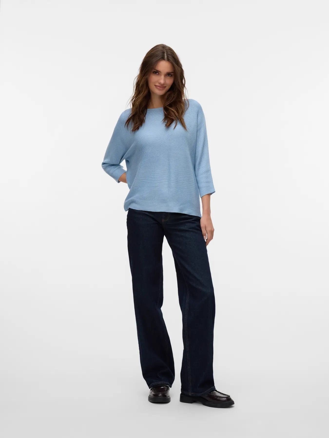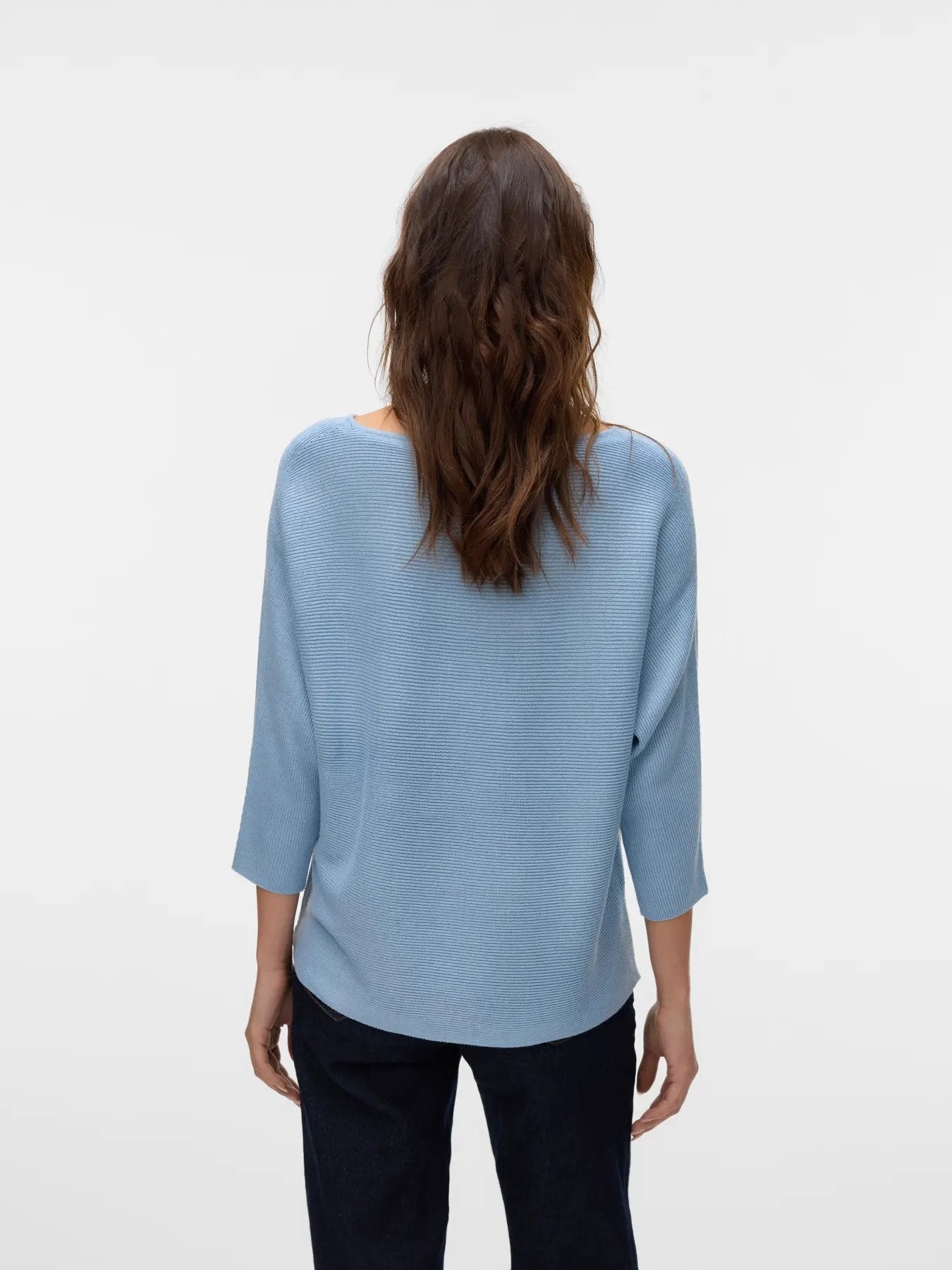 Der Stoff ist flach gestrickt aus einer Mischung aus 63 % recyceltem Polyester, 32 % Viskose und 5 % RWS-zertifizierter Wolle und kombiniert Wärme und Weichheit mit einer durchgehend sichtbaren feinen horizontalen Rippenstruktur. Der U-Boot-Ausschnitt sitzt weit und offen über dem Schlüsselbein, während die Fledermausärmel ein entspanntes, fließendes Volumen an der Schulter erzeugen, das sich zum 3/4-Manschettenrand hin natürlich verjüngt. Die reguläre Passform fällt vom Körper ab und hat eine sanfte A-Linienform, die aus jedem Blickwinkel bequem und schnörkellos ist.