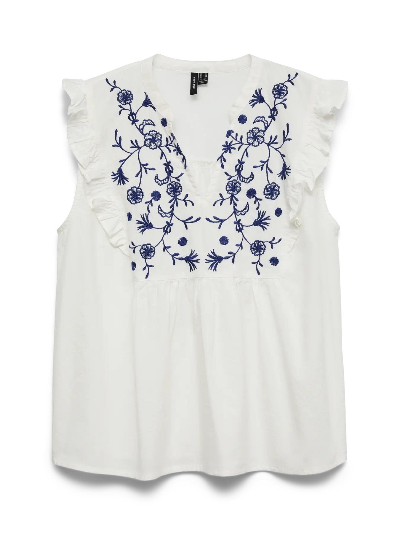 Hannah Chambray-Top mit V-Ausschnitt, Stickerei und Rüschen