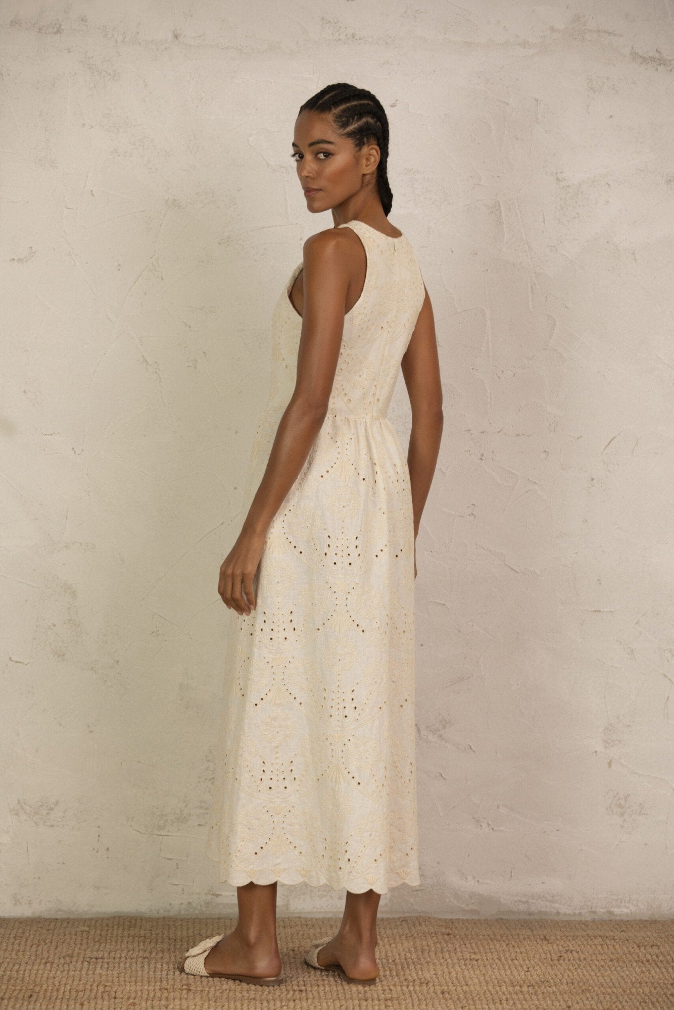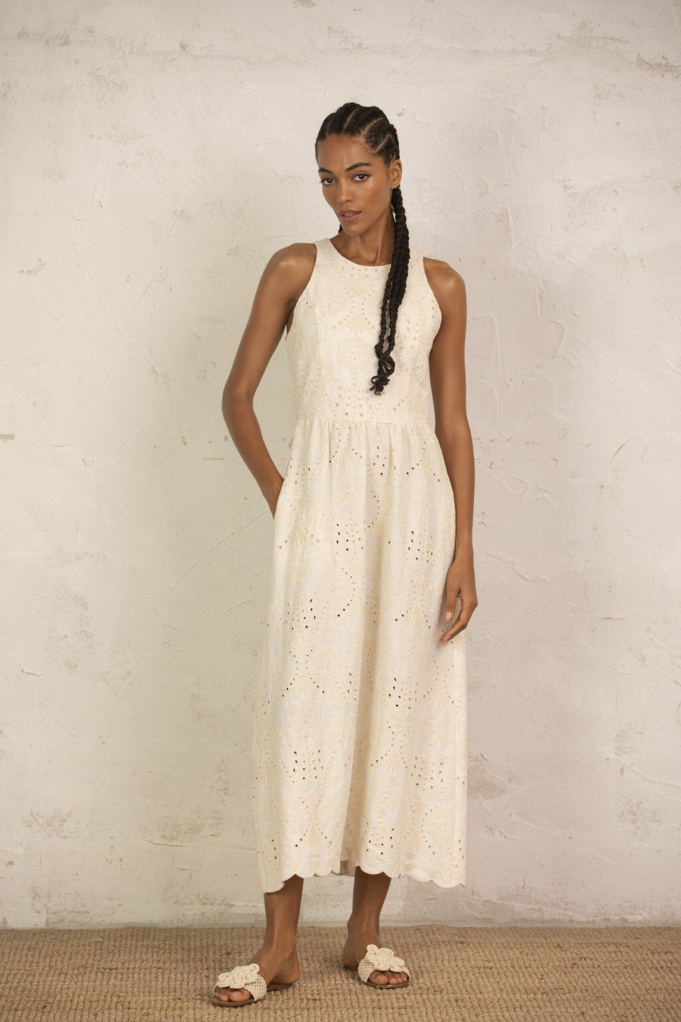 Maxi embrodery anglaise dress featuring a high round neckline and a sleeveless design.