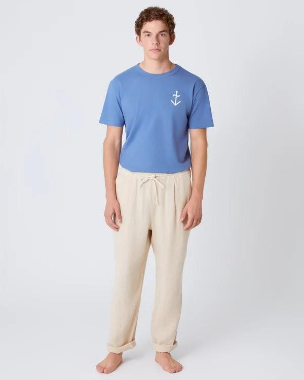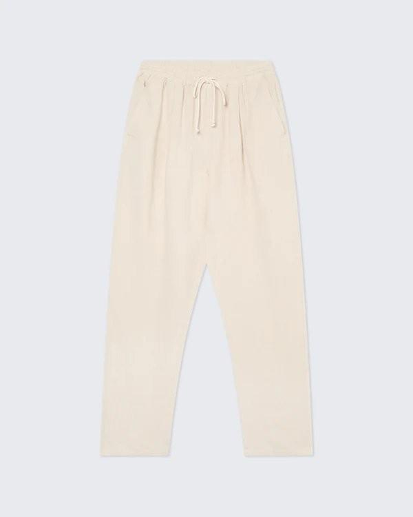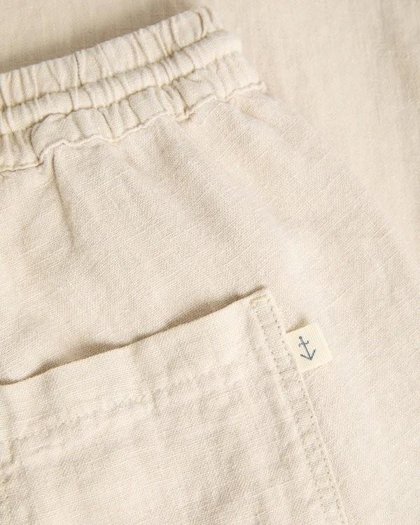 Linen trousers with a drawstring waist, front pockets, and a single back pocket featuring a small logo tab.